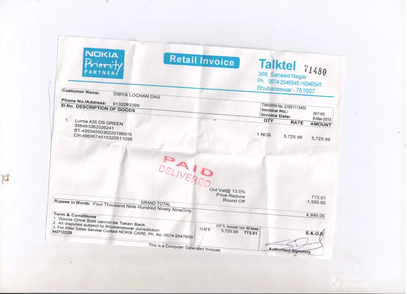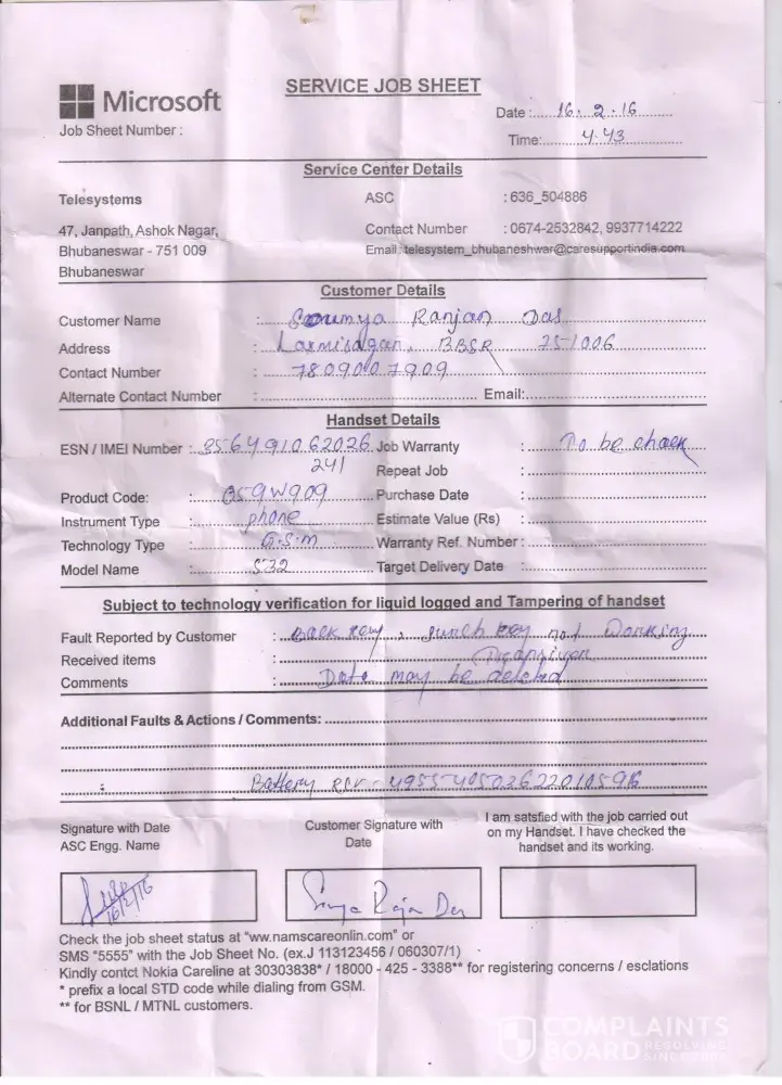 i diposite a microsoft lumia 453 in ashoknagar microsoft service center bhubaneswar, odisha. My pho imei num is [protected]. I diposite on date 16.2.2016. My pho has touch screen problem. One month over but my pho is not repair. So i face mor problems, because i havenot other pho.