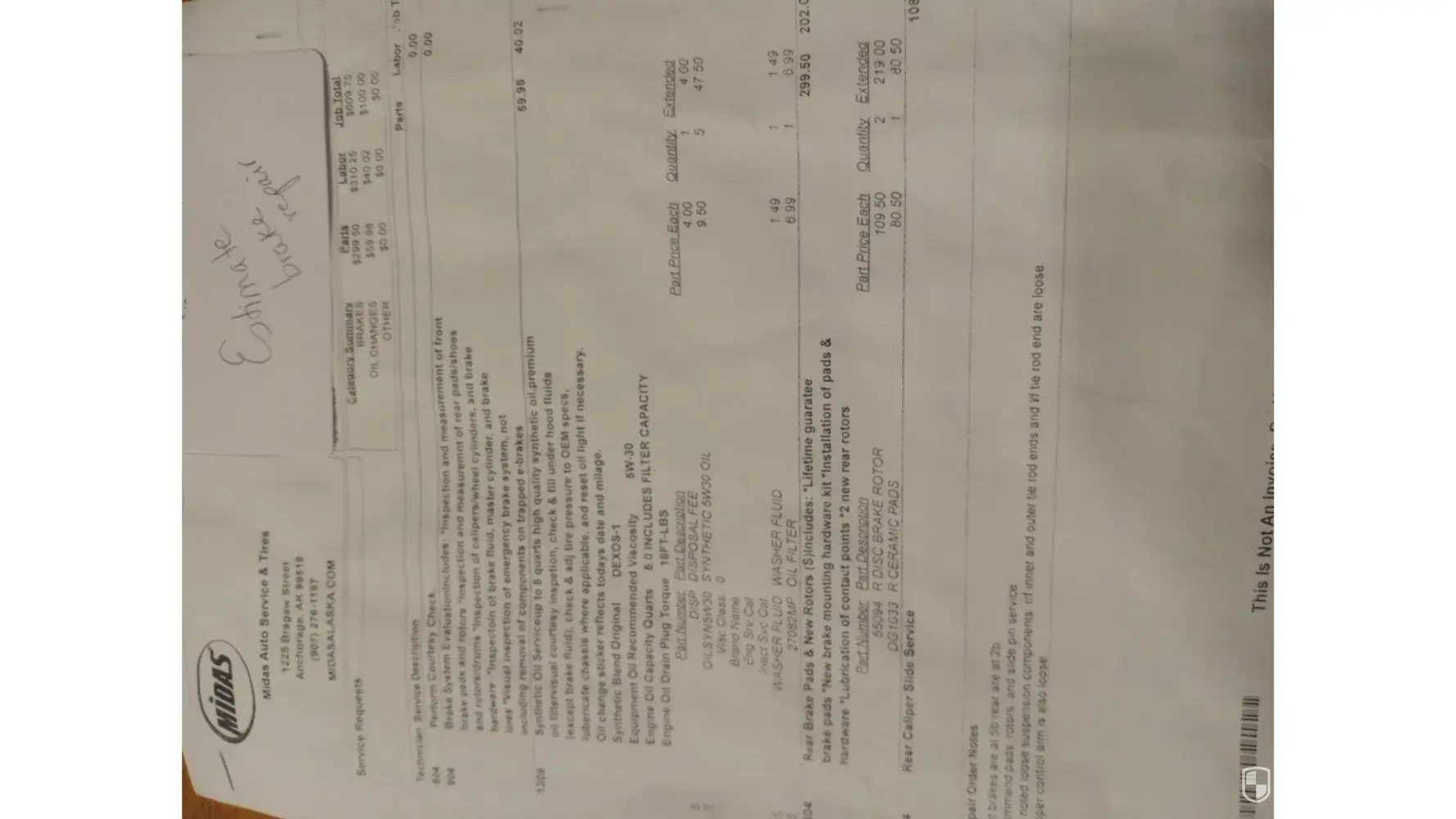 On a hot summer day 7/8/2019 ,going to do some airconditioning calls.heard noise from frontbrakes,pulled in to midas at 2390 finch ave.east.,They told me I need new brakes,I asked for an estimate,they told me it will take some time so i left the vehicle with them.asked to be called with the estimate.Three hours later I called,Jack ,the owner told me the job is done.No estimate was given.I went to see Jack surprisingly ,Iwas presented with a bill of $1794.28.I questioned the bill and was told some of the parts has lifetime warranty.I paid the bill.,On Sept.22/22,I went to my regular mechanic for an oil change and tire rotation,I also asked for a brake inspection.Iwas told the front brakes are worne out and the back brakes has about 10% left.I asked for an estimate and was given a price of$944.84 4 rotors&4 sets of pads and that I dont need calipers,they are in good shape,labour& taxes were included in this price.I went back to Midas to see if Jack can match the estimate,he said no,the best he can do is $1308.67 seeing that the pads are still under warranty and i dont need calipers.I got the job done by my regular mechanic for $944.84.