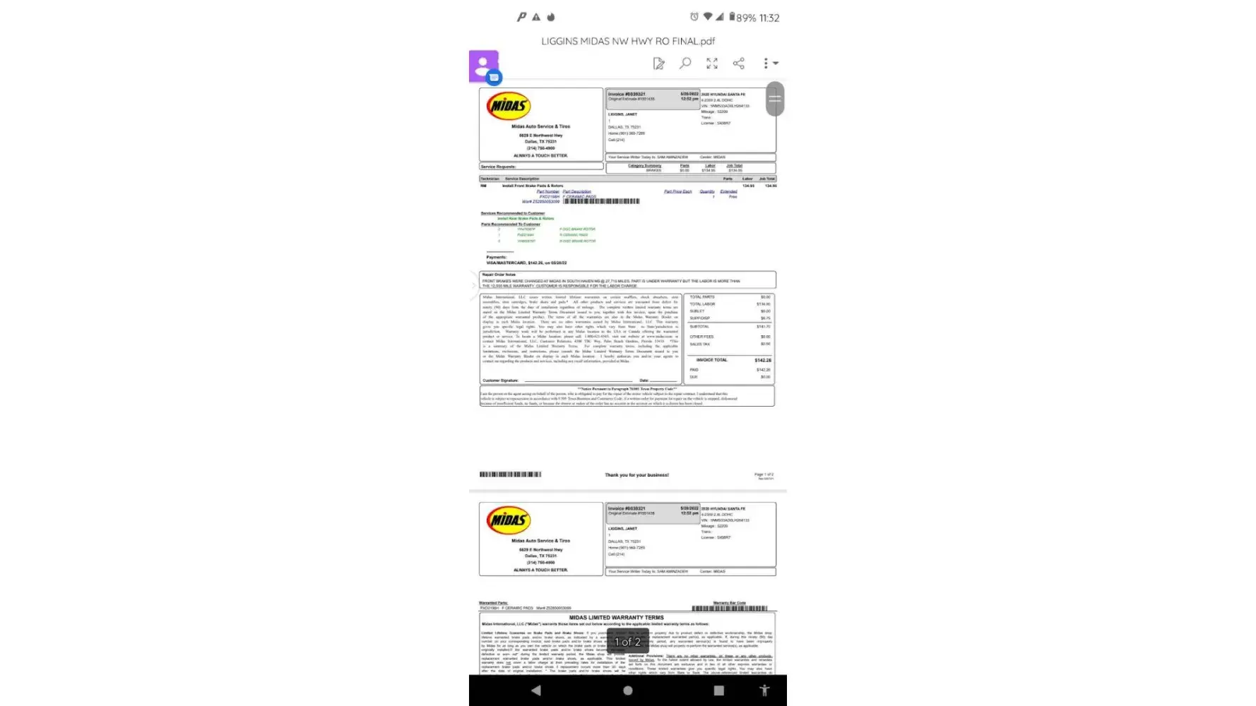 I went to the Midas at 6629 E. Northwest Highway; Dallas, Texas 76231, to have brake pads installed on my 2020 Hyundai Sante Fe with the vehicle identification number (VIN) 5NMS33AD0LH264133 (see attachment brake replacement receipt MIDAS). I paid a total amount of $142.26 for the service. During the brake pad installation, I informed the store manager, Sam Aminzadeh, that I was traveling to Nashville, Tennessee, and Roswell, Georgia, on May 28, 2022. I traveled during the night to ensure I was at Rick Case dealership in Roswell, Georgia, early on May 28, 2022, to ensure my vehicle received service from the dealership's mechanic.