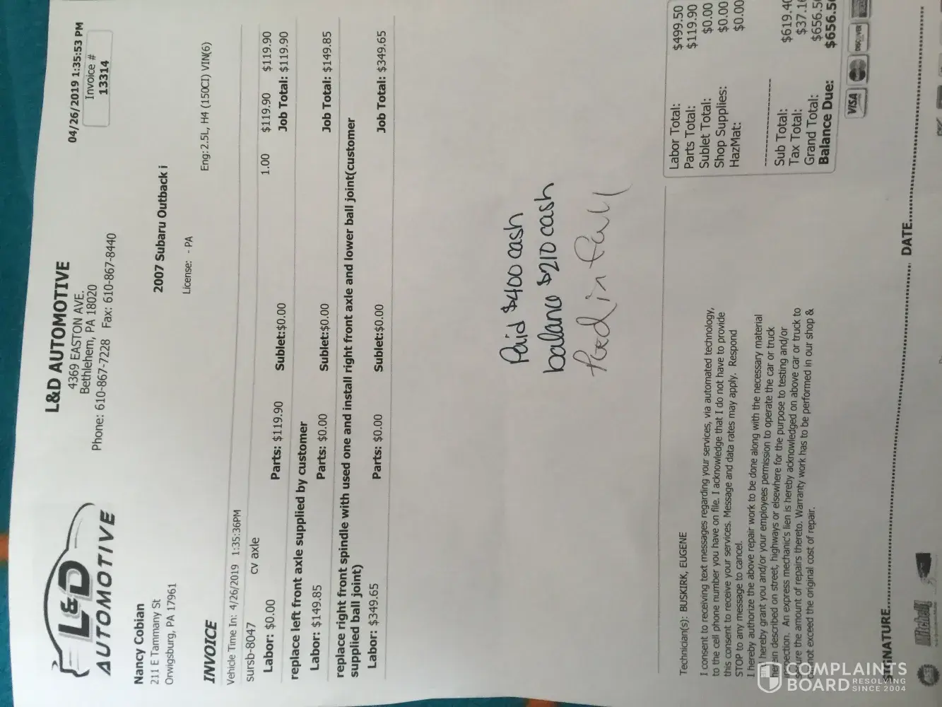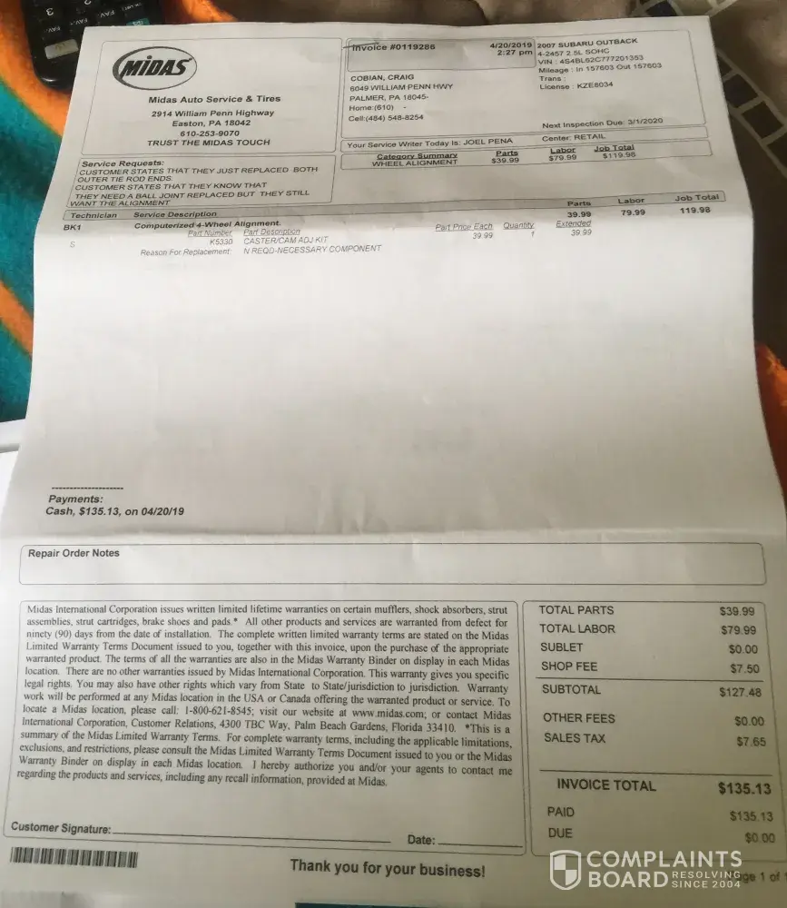 Took my daughters Outback in to get an alignment because it was pulling to the right and just had tire rods put on the front-so I told the guy it might need a ball joint on the passenger side and he said ok-so after an hour they said the car was done and I paid them 135.00 and got in the car-so when I drove down the street the car was making a horrible...