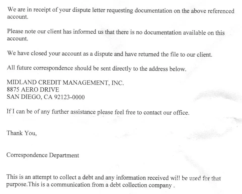 We have sent Mid-land Credit Management a letter of debt validation...over a month later we get a letter in the mail stating-