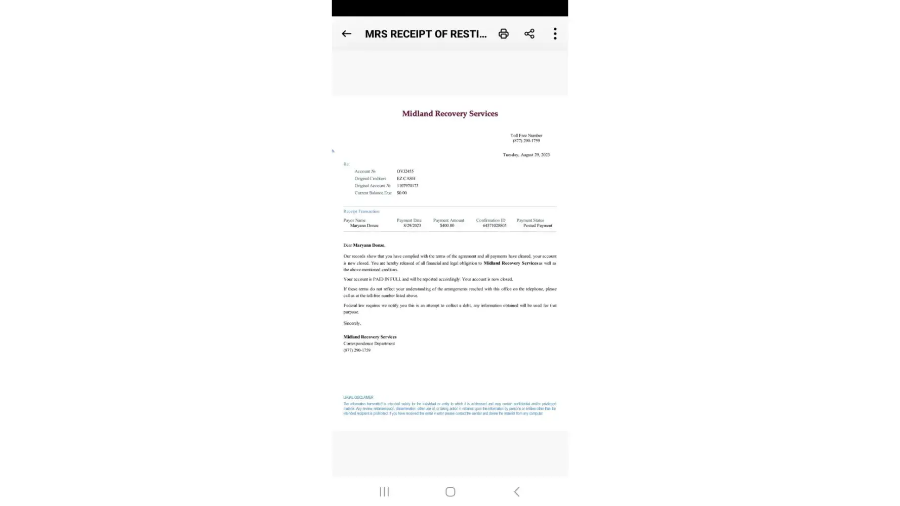 Midland responded in a letter to dept. of consumer affairs stating-they would case any collection.