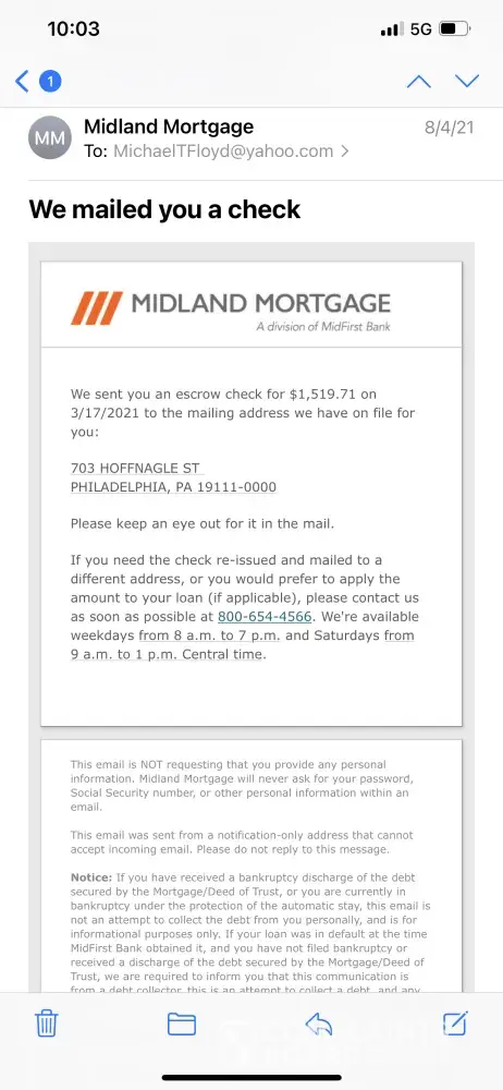 Long story short, we paid off our mortgage 6 months ago. Midland sent a check of the balance of the escrow account. After waiting weeks to get it, I contacted them. I was told it had been cashed and was sent a copy of the check. Needless to say, it was stolen and fraudulently cashed. I reported it to their fraud department, followed their directions on what...
