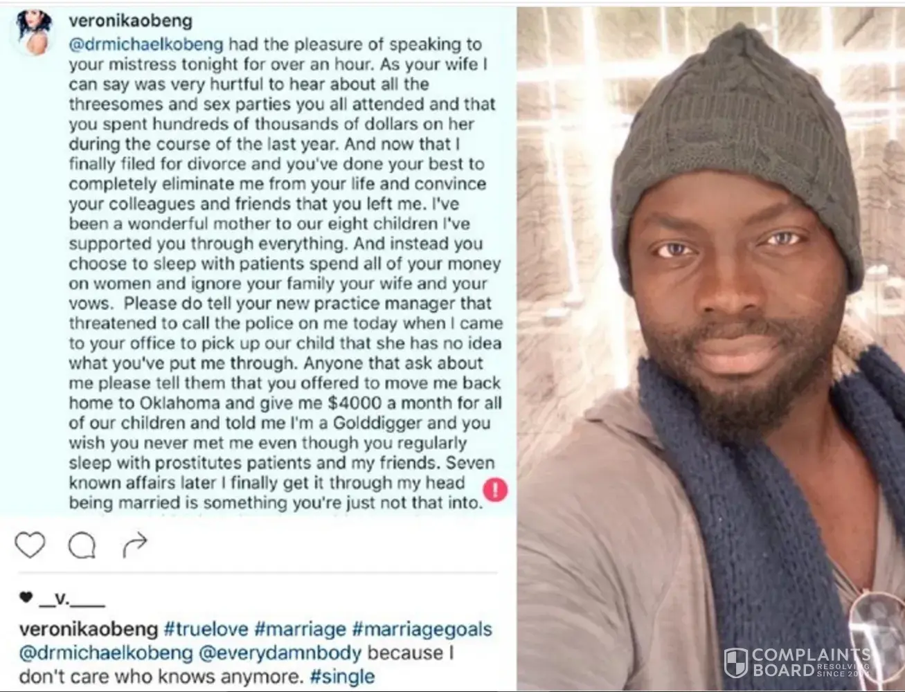 My friends husband, Dr. Michael K Obeng, is a ###. Read what she posted and decide if you ever want to go visit him for plastic surgery. I will attach her actual Instagram to this complaint as evidence. " veronikaobeng" @drmichaelkobeng had the pleasure of speaking to your mistress tonight for over an hour. As your wife I can say was very hurtful to hear...