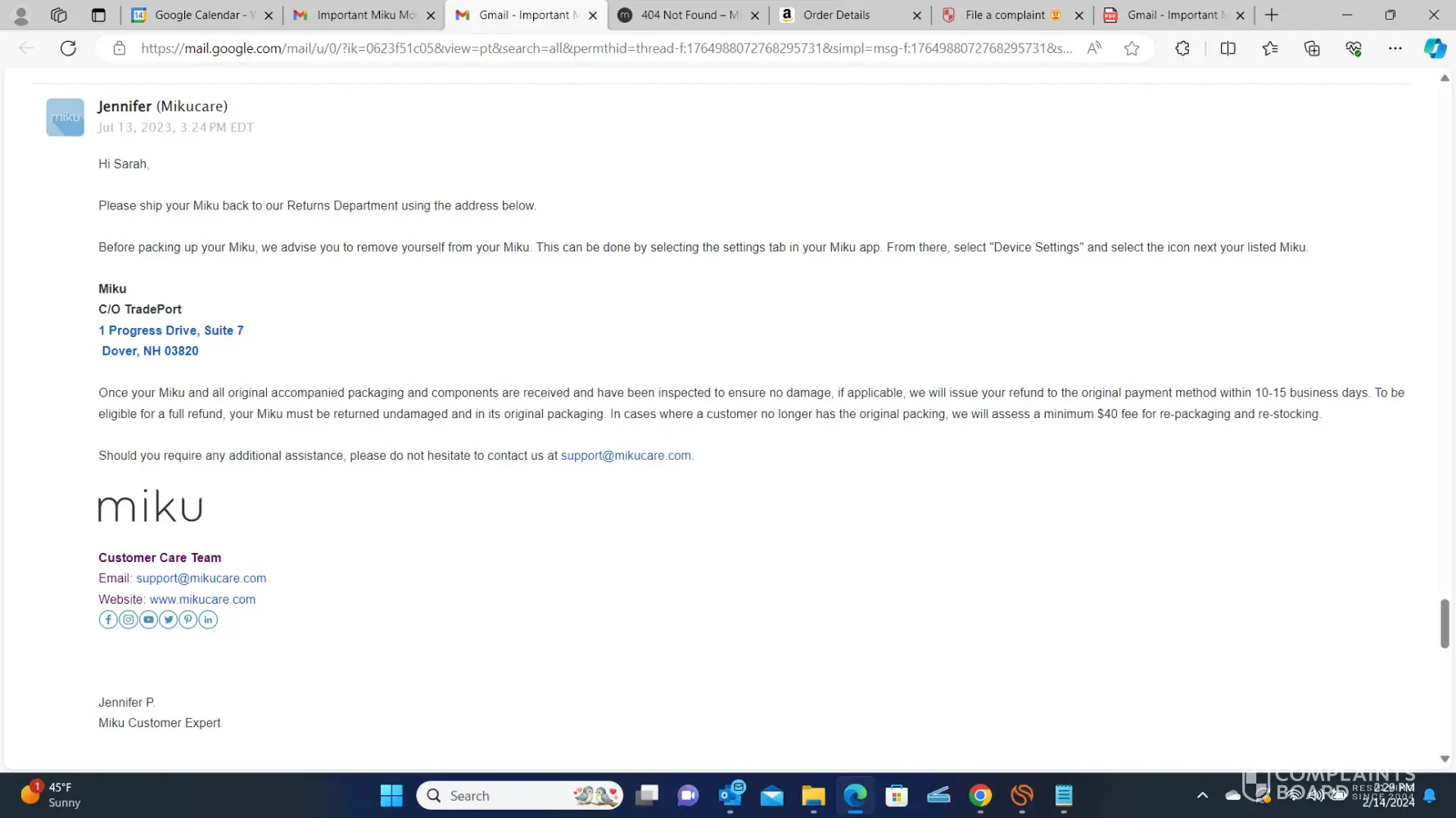 I tried to return it via Amazon, but Amazon made me contact Miku directly. The Miku rep told me to mail back my Miku for a full refund; however, they have never issued my refund and have stopped responding to any emails or online contact us forms. I have been following up with them countless times since July 2023.