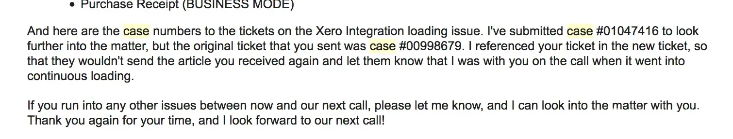 “I've submitted case #[protected] to look further into the matter, but the original ticket that you sent was case #[protected]. I referenced your ticket in the new ticket, so that they wouldn't send the article you received again and let them know that I was with you on the call when it went into continuous loading.â€