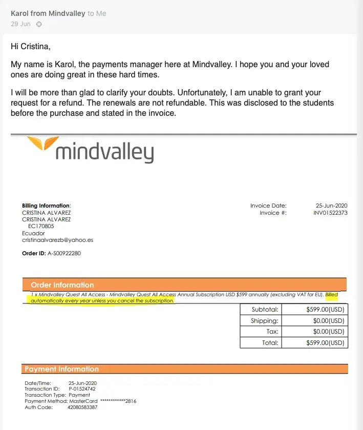 I was informed that MindValley sent a reminder email, I didn't receive that email, because I would have canceled the subscription immediately