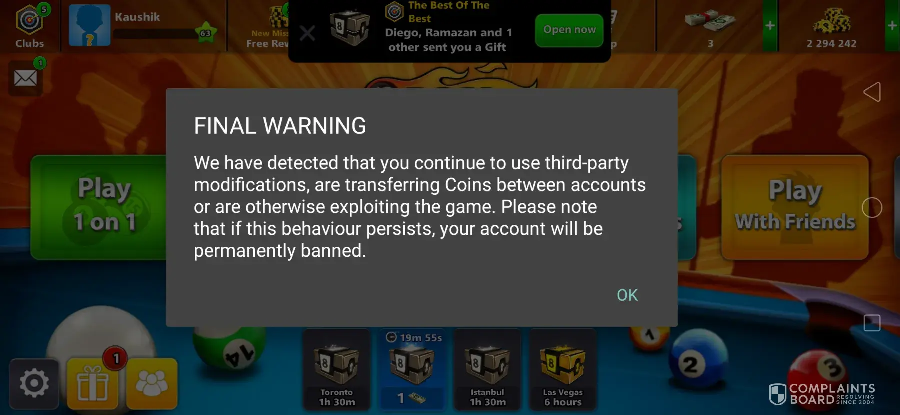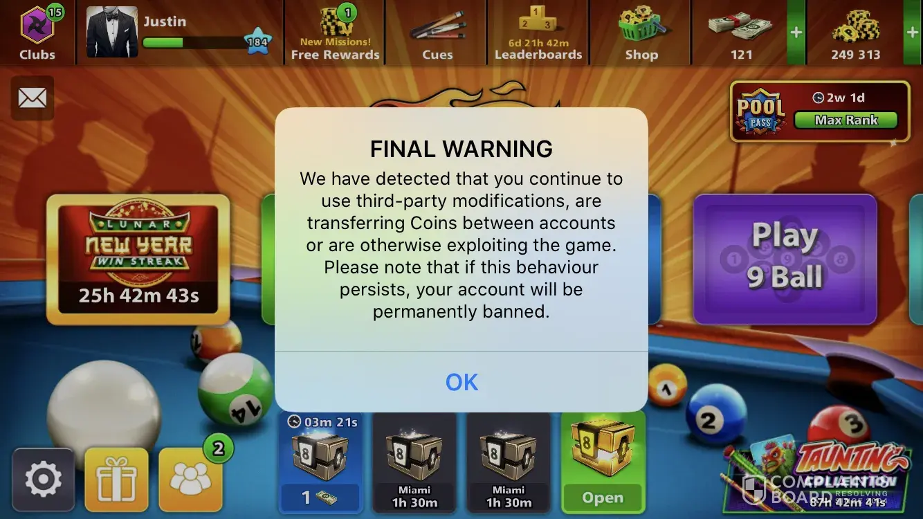 Warning for helping my friend get coins, there's no need to taken my coins of me though as I've been playing 8Ball for few years now and I've not made an offence before, I was wandering if it's possible to get the 102 million coins back please on to my account which is photographed below .