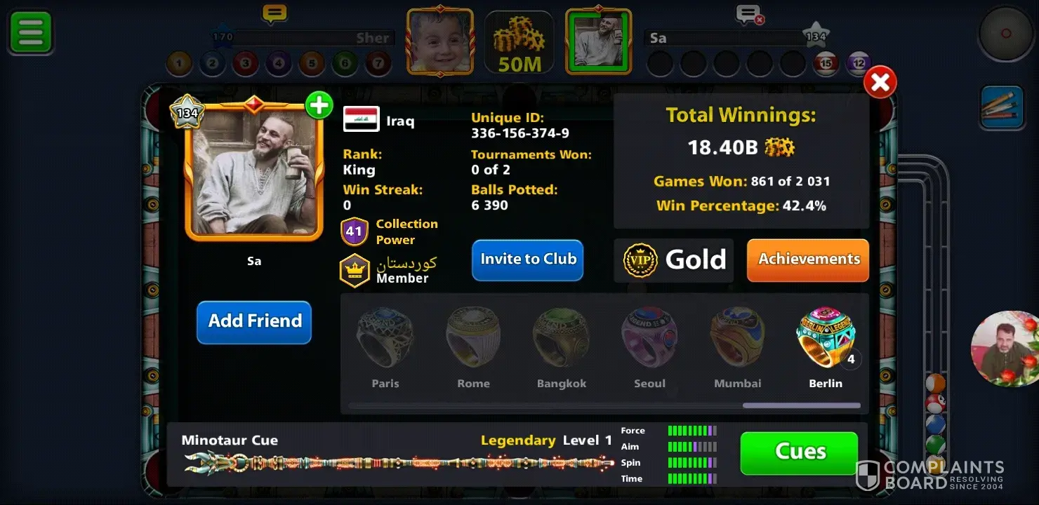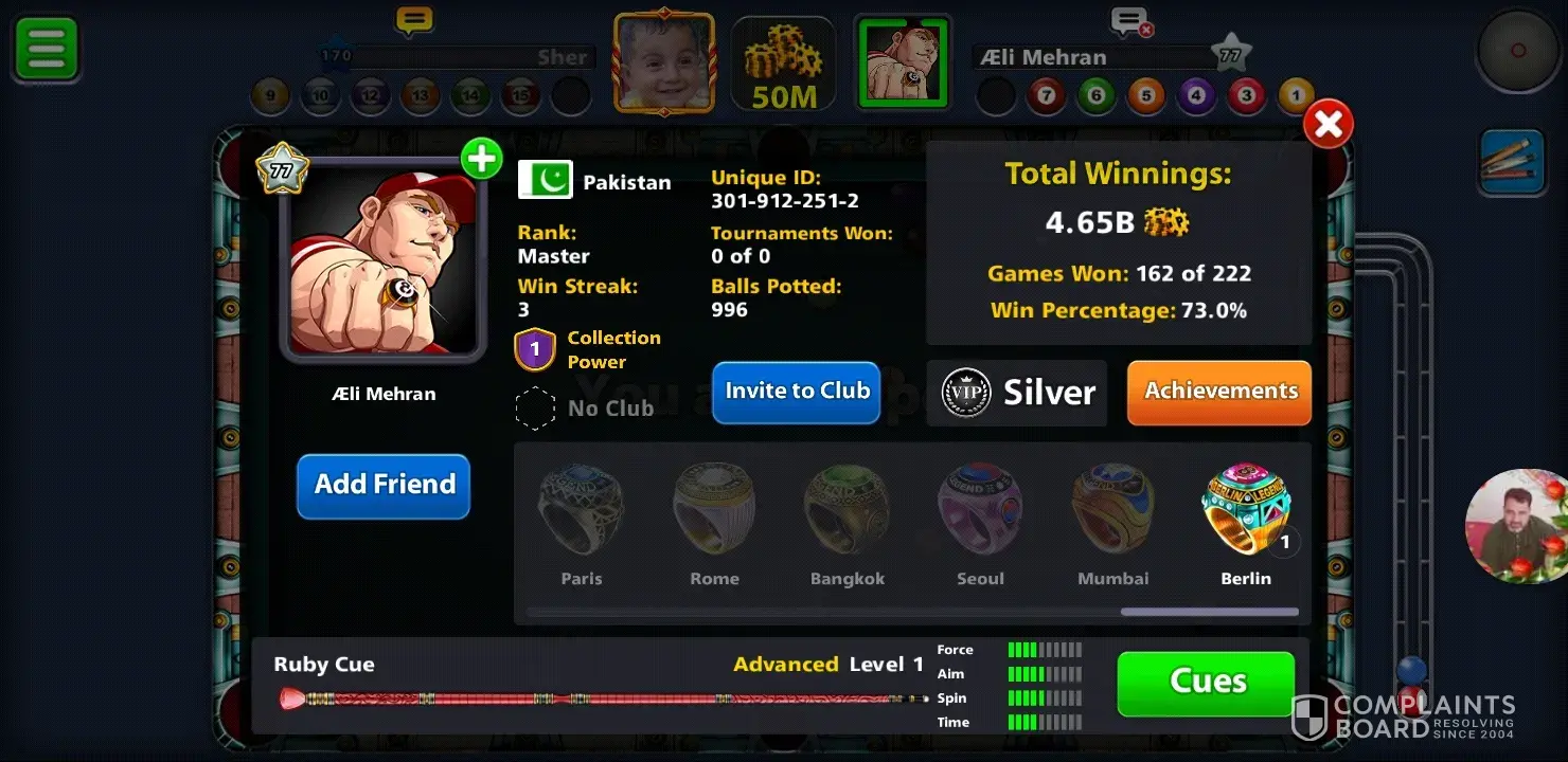 Now a days in berlin some hackers r ruining the game. They play random and frequent shots any where randomly but every time ball is potted. Even hardest snooker they play random shot and pot the ball. I have lost some games in my 2 separate accounts. Plz care your 8ball game, before it destroyed. Thanks. Hope you will tighten the hackers. 1 pic of the hacker account is attached. It's id is