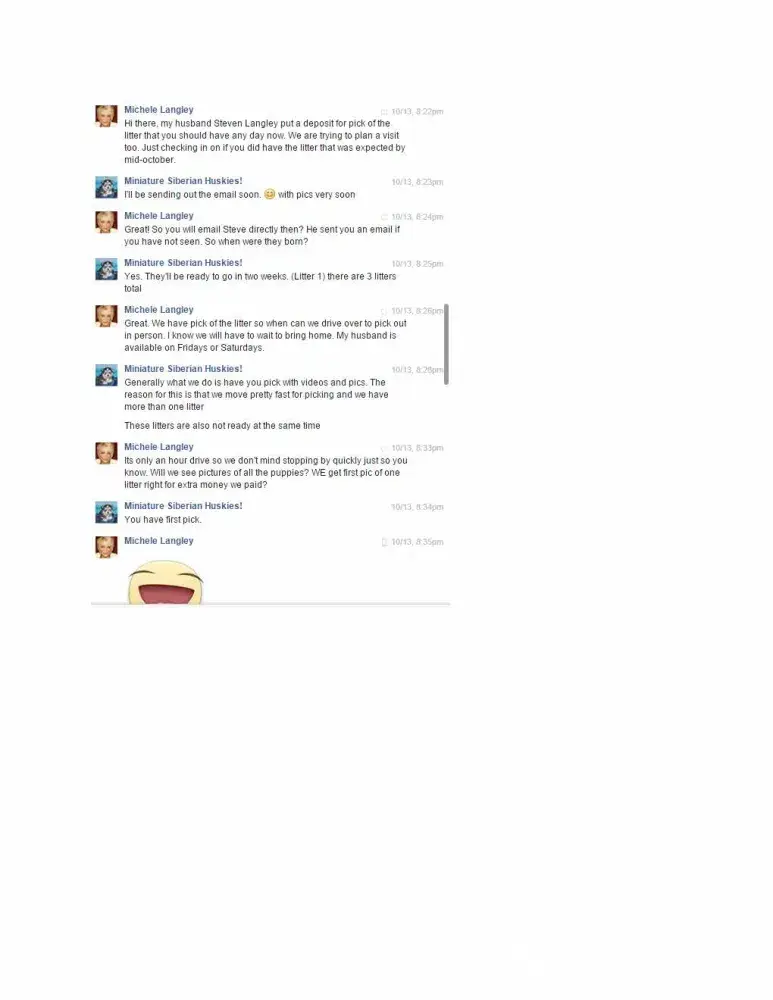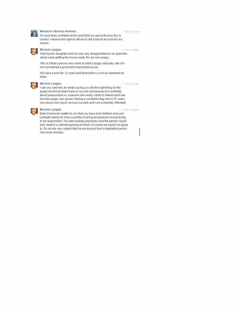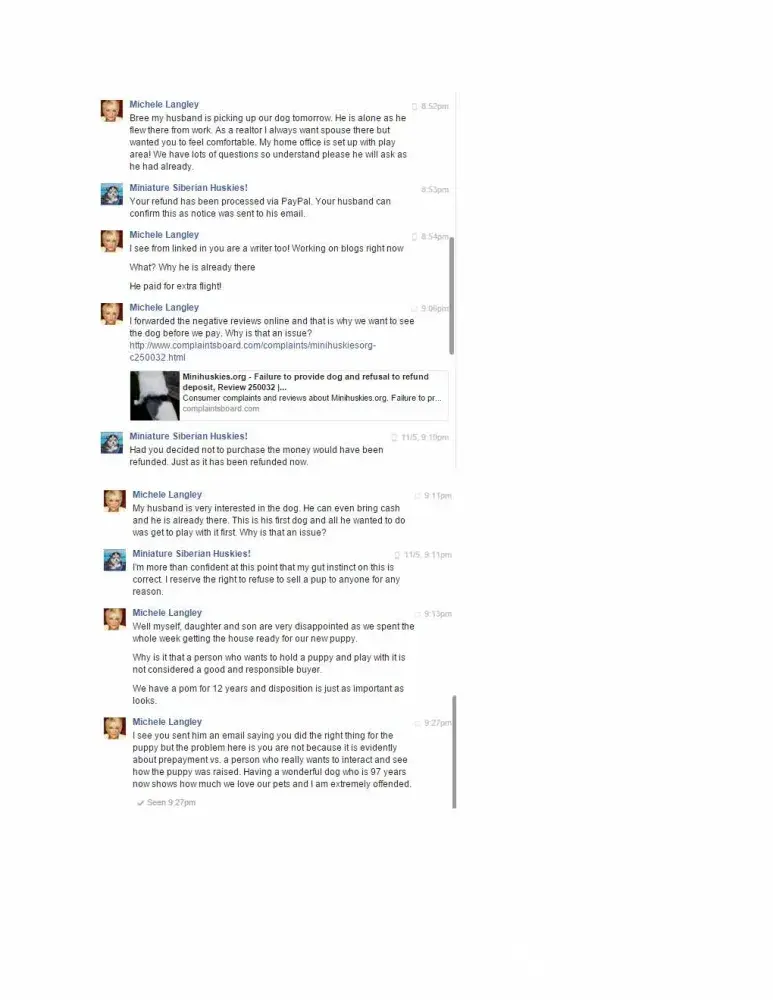 Today I am looking at a play pen set up for my new mini husky in my office that is empty. Why is it empty? Let me share my family’s story to hopefully prevent you from having the same disappointment. We put a $150 deposit for a puppy In June 2015. Bree Normandin stated she goes off waiting list, but would not confirm that I would get a call, where we were on the list, and just told us to keep checking her website for available puppies. Seemed strange to me that would accept a NON REFUNDABLE deposit but could not indicate how many people were before you. Granted it does depend on the type of characteristics you want in a dog. So wanting a dog for my daughter’s birthday next week, we decided to pay extra for “Pick of the Litter.†Below is the description from her site. If you’re hoping to purchase a Miniature Siberian Husky but you need a pup within a specific time frame, you have the option of choosing pick of the litter. A buyer who occupies this position will be allowed first choice of available pups in the next litter. The buyer has the option to choose a pup or wait until the next litter and have first pick of available pups. The buyer who occupies this spot will be called immediately when puppies are born and will be given first pick at 3 weeks. There is a $600 nonrefundable fee to occupy this position and it is not deducted from the purchase price. ONLY ONE PERSON CAN OCCUPY THIS POSITION AT ANY GIVEN TIME. If you are interested in obtaining pick of the litter, please contact us at [protected]@gmail.com. A couple of weeks ago I saw that she had posted dogs available, I asked why we were not contacted since we paid for pick of the next litter. Bree replied because none of the dogs met your criteria. We had asked for a female with blue eyes and strong markings. She posted 3 dogs on her site but we have no idea how many were actually in the litter. So the statement above “a buyer has the option to choose a pup or wait until the next litter†is incorrect since we were not given the option. My husband gets an email this week that our puppy is ready with a picture. Note that we did not get pictures of any other dogs in the litter. The puppy seemed to be what we were looking for so we got excited. We asked for additional pictures like side view and was told she did not have the time to send us anymore pictures. Also note in the attached facebook conversation, she stated we would get videos too which I assumed would be of the litter. Having researched how to pick a puppy for your family and having paid for pick of the litter, we thought for sure that we would have the opportunity to interact with the puppies. And at a price of $1450.00 we surely wanted to make sure that the puppy had the disposition to blend with our dog who has been with us for 12 years now. http://www.wikihow.com/Pick-a-Puppy-from-a-Litter We did not like the idea of our puppy being mailed and wanted to interact with the puppies, see the parents, so my husband flew to Asheville to pick up the puppy and was going to drive her back. He bought a crate, I had already bought toys, playpen, bowls, floor covering, prepared the house to be puppy friendly which took me hours from my work to focus on what we thought was going to be our new family member. We had showed the picture to friends and my daughter had too! We had bought multiple books on training dogs. After having flown to Asheville, my husband gets an email stating he would need to pay on PayPal before coming to get the dog and she kept saying she would meet him at the airport. He was persistent that he wanted to see the dog first, would pay then and we could even bring cash if needed to. He was very concerned that once he paid, she would then not let him come to see the puppy’s environment and how she interacted with others. I also have found this site and sent it to him with my concerns on some of the issues presented as it appears that refunds were only partially given. When he would not agree to pay until he saw the puppy, she refunded the money and said we could not have the puppy as she reserves the right not to sell. She stated if we did not like the puppy she would have refunded all the money, but from previous comments, it was hard to believe. I had not known that he received an email cancelling and sent her a FB message which I have attached our correspondence from the beginning. When I had read these issues, I thought maybe they were made up or isolated cases but you can see now there is reasons to be concerned. It seemed very clear that because we wanted to see the puppy we were asking for too much and she then acted like we were doing something wrong! If you are having your dog shipped, I truly hope you got the puppy you thought you did. From a previous post, it looks like some puppies do not ship as promised. Be cautious of giving a deposit because you will not get it back and it seems that she takes a lot of deposits. I see a lot of post on the website were people say they have been on the list for over a year and still do not have. Note that the site states the dogs will be 15-25 lbs. However, I was able to find 2 owners of dogs that were purchased at both of their dogs are over 35 lbs. Notice that you do not see testimonials on her website and very few grown dogs. So these dogs are smaller than huskies, but are not mini sized dogs. You are being enticed by puppies not their mature look. We do have documentation in an email that Bree later stated she could not guarantee the size, so the website is misleading consumers. Note also that she states she is a member of the Miniature Siberian Husky Club of America. After further review, I see this is her own blog site. I do not know if this is truly a national organization as there appears to be no other members. Compare this to the site http://www.akkaoa.org/ which has a board of directors, multiple members, and list of breeders. No I am not a member of that site or affiliated, I just started inve