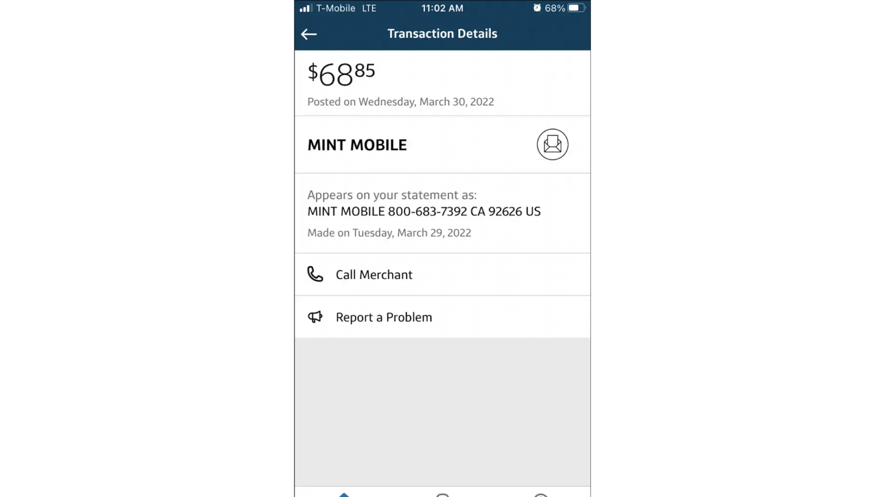 Mint Mobile - negative$51.25 Mar 9 Payment Loading transaction details for Mint Mobile - negative$51.25 Mar 9 Payment Paid with JPMORGAN CHASE BANK, NA x-1690 $51.25 Ship to Dean Da Silva "Address" 405 Poe St Quitman, TX 75783 United States Transaction ID 36515986EE457233A Seller info Mint Mobile [protected] Invoice...