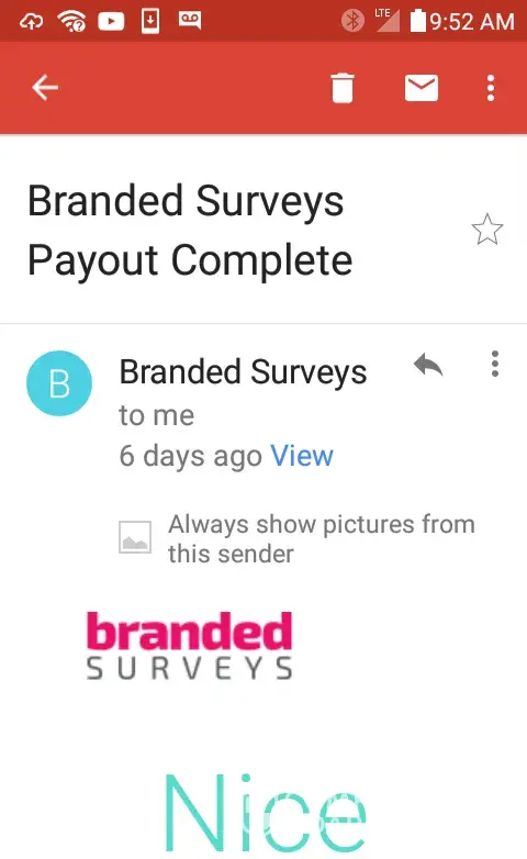 Branded Survey is a total Fraud...They make answer their freaking questions...you earn the points, and in good faith you summit the payment, but at the end they will reject the points... NO PAYMENT, and if we start complaining they will block the account and there is no respond from them... Since Dec24th 2017 NO payment nothing, I have sent 6 emails and nothing. $17.56 burn...