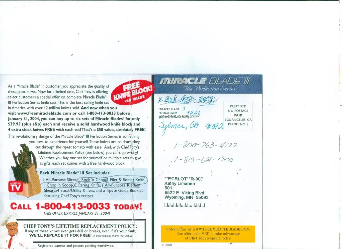 I have been given the runaround every time I try to contact someone to help me. I have had my knives since 2004 and love them. I have broken a few and some have dulled. I want the warranty that guaranteed if they ever dulled or broke, they would be replaced. The new warranties state they will replace if defective. I have been trying to contact them for months! Please provide a valid # to call to get this resolved.