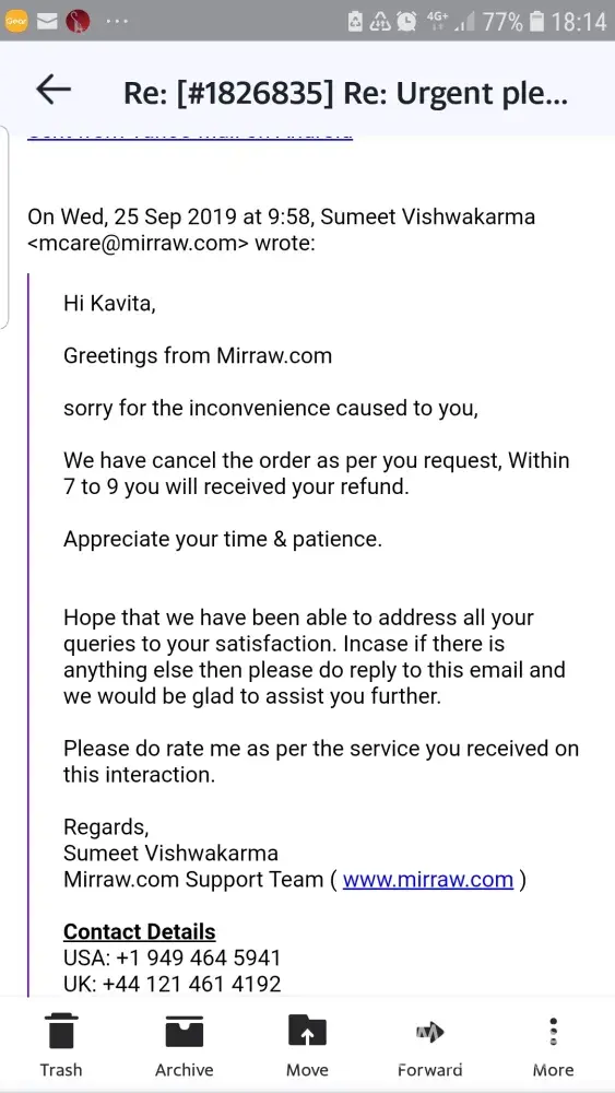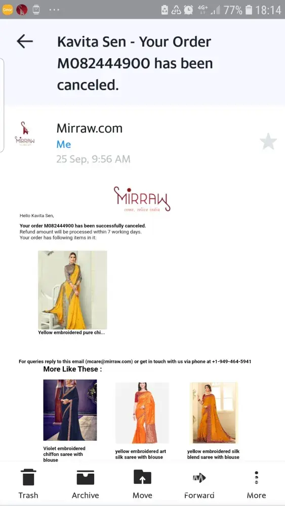 2. When initiated return request, confirmation email says I will get refund of rs. 1400. Seeing this email was so frustrating, followed Mirraw CR and after banging my head for 2hrs with them got confirmation that whatever I paid, I will receive the same amount of refund.