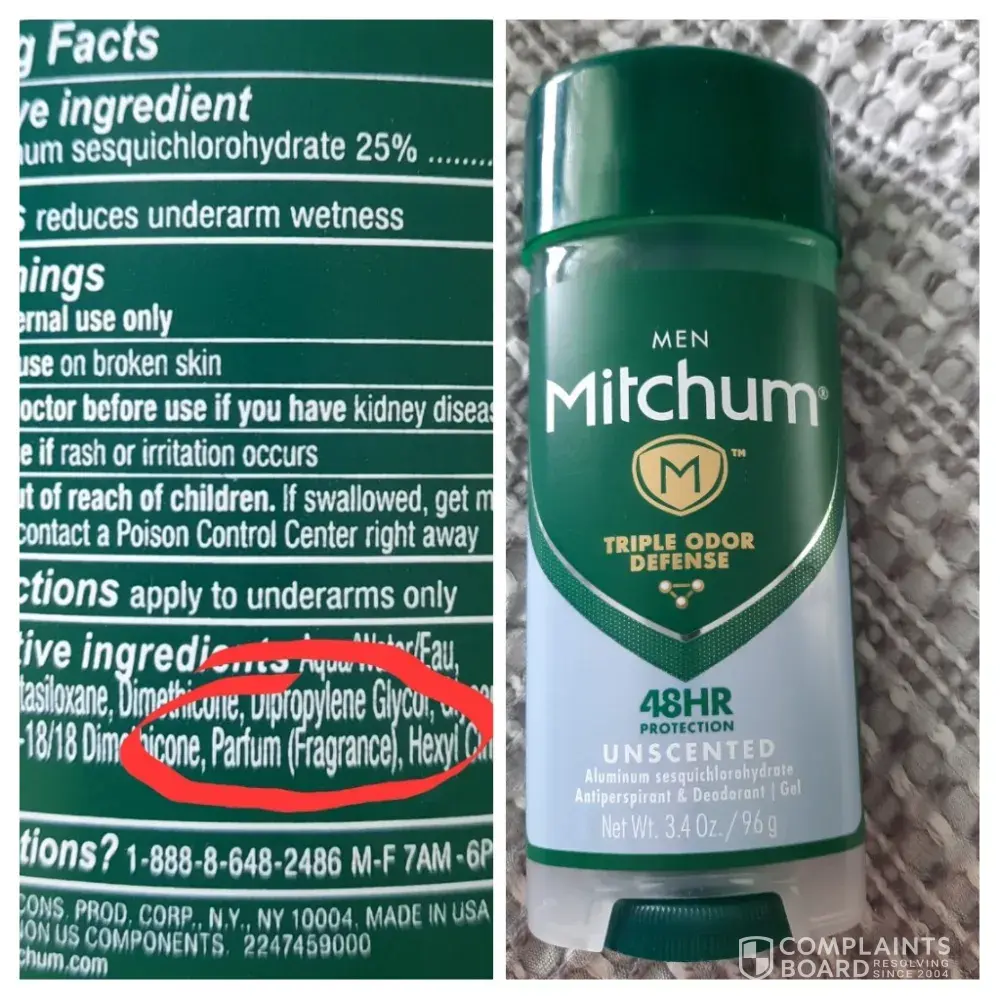 by the way, I found an old half-used container of the good mitchum unscented from a couple years ago, and it did say fragrance in the ingredients list, see photo. Hopefully this was a one-time screwup at the factory.