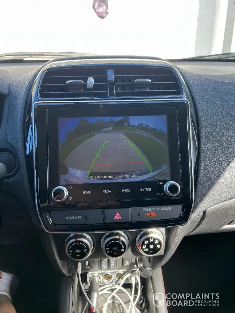 > he backed up and struck another car causing $1,000 in damage. This is my 4th Mitsubishi and I never had a problem with the other three. The Outlander Sport that I traded in had a backup camera that was bright and clear. There should be no reason that this camera is not the same. I am very unhappy with this car because of this. I would like to have a regional director see this with his own eyes and tell me there is nothing wrong with this camera. Thank you