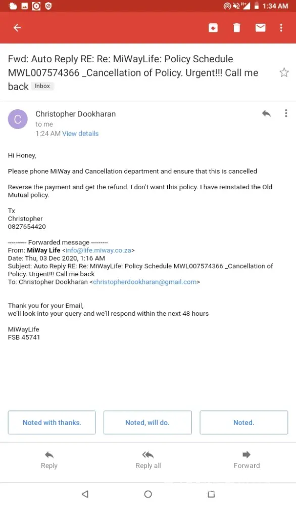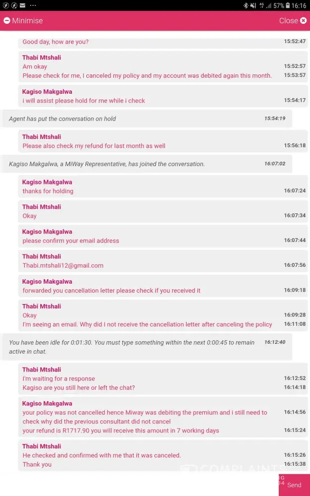 This is now the fourth attempt I'm making to recover the funds Miway has debited from my account after I canceled the policy. The promises made are all in vain. The attached conversation has not been honoured.
