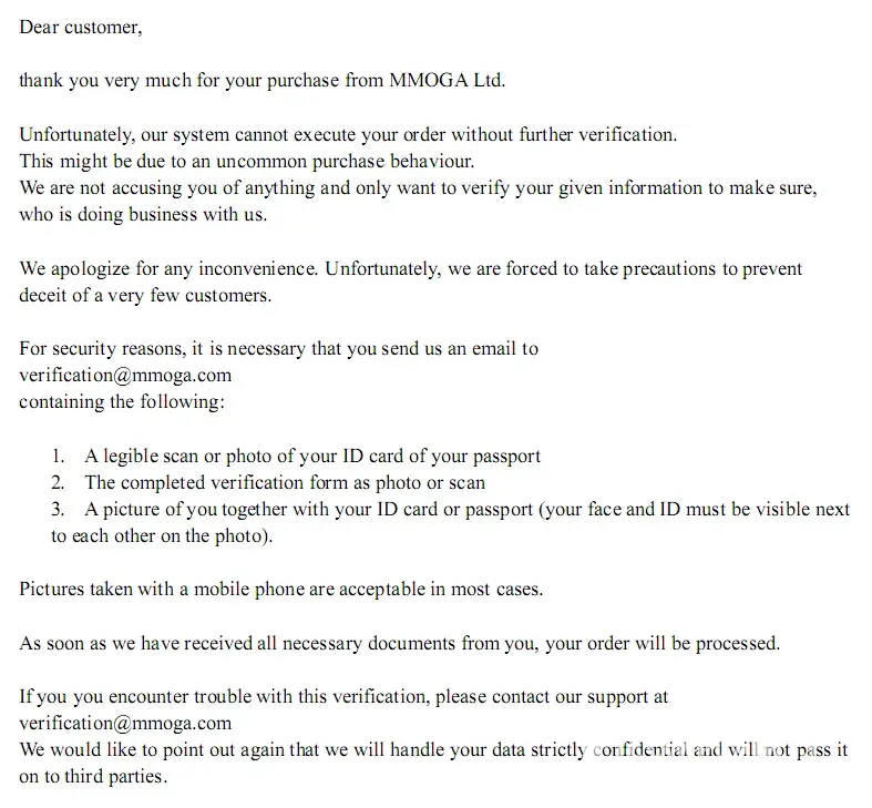 I was shopping for an expansion key for an old game and had some bitcoins I wanted to use up; and while mmoga.net looked like an obvious scam site, I figured I'd give it a gamble since they were selling the expansion for like 3 bucks. I made the order, got a legit key, so decided to gamble a little further and buy a 25 dollar game card from them. After paying in bitcoins - which are impossible to "charge back" - they emailed me saying that due to fear of chargebacks, they couldn't send my order unless I "verified my identity" by following a form they'd sent me - which told me to scan my id card, passports, a photo of myself, and a signature. Needless to say, mmoga.net is exactly as big a scam as you can expect from anyone that includes "gold selling" in their business model.
