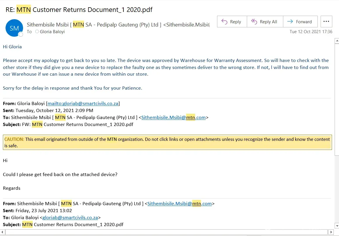 Went back again 23 July to book it in for repairs. I was assisted by Sithembisile Msibi. Router was booked in and was told I will receive sms or get a phone call at the return of my router. I had to send email request feedback on the router on the 12th October 2021. No communication was done whatsoever from Mtn Northgate.