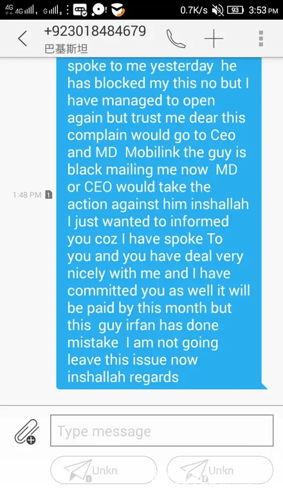 Hi i would like to inform to New( Ceo Mr Aamir ), the collection department person named Irfan supervisor extremely rude and acting like a head of Mobilink or ISI Head or director NAB Officer well he called me from his manager no and he threatened me to pay the bill immediately otherwise I'll block your other Warid which I am using since long time regular paying the bills due of other Mobilink no is on my.mother name actually both numbers on her name I use the Warid no other one also I'm use only delayed the bill payment which I have committed I'll pay off end of this month well I told him I don't want to talk you and then he starts misbehaved with me like he is doing recovery of millions i told him i will talk with some other person not you then his manager( Mr Irfan asst manager ), take over the phone and he deal with me very nicely apologized with me on behalf of his staff bad behavior then i become calm and I have committed with him I will pay the dues end of this month for sure but the guy Irfan to whom i have spoke to me he took this personal and blocked my Warid no just Tp tease me and show his power he has blocked my this no but I have managed to open again and I have called his manager he didn't pick the calls then I have send SMS to him this note ( trust me dear this complaint would go to Ceo and MD Mobilink surely the guy is black mailing me now and I will surely let your CEO would take the action against him in shall ah I just wanted to informed you because I have spoke To you and you have deal very nicely with me and I have committed you as well it will be paid by this month but this guy irfan has done mistake I am not going leave this issue now inshallah regards ) well I just want MR Aamir should take action against him today its been long while as i am platinum customer I really never have experience this in Mobilink Telecom in my history so kindly do take this guy Terminated on immediate effects as I am going to send the legal notice to Mobilink as well for the blackmailed me and cut of my other no which has Awesome billing history never have any issues with warid staff or Mobilink staff like this how he showed me his power of simple TL of collection department well I want to requested Mr Aamir Ibrahim to take an action on this guy hope someone would inform me or deal me regarding this issue thanks