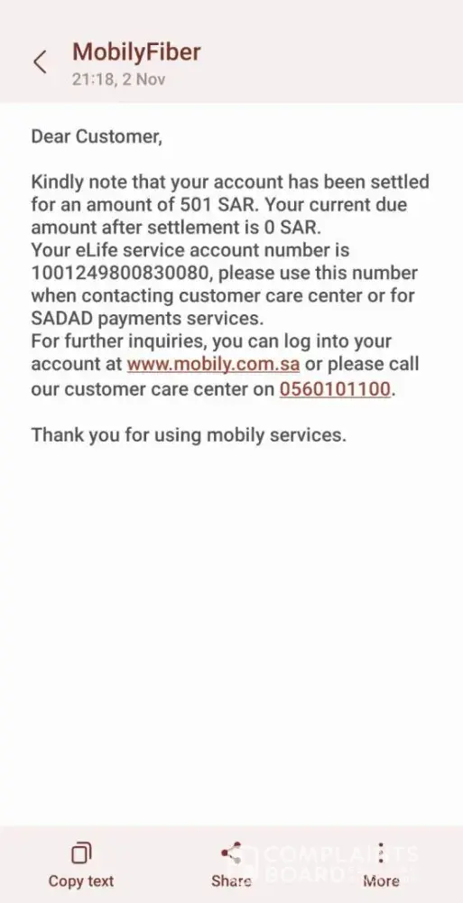 My name is Mahammad Rafeek Abdulla. I have been using a Mobily WiFi connection for the past two years under Account No. 1001249800830080. Approximately two months ago, I officially requested the cancellation of this service through Mobily customer care and the Mobily office. As instructed, I paid an amount of SAR 501, after which my outstanding balance wa...