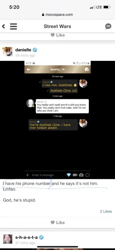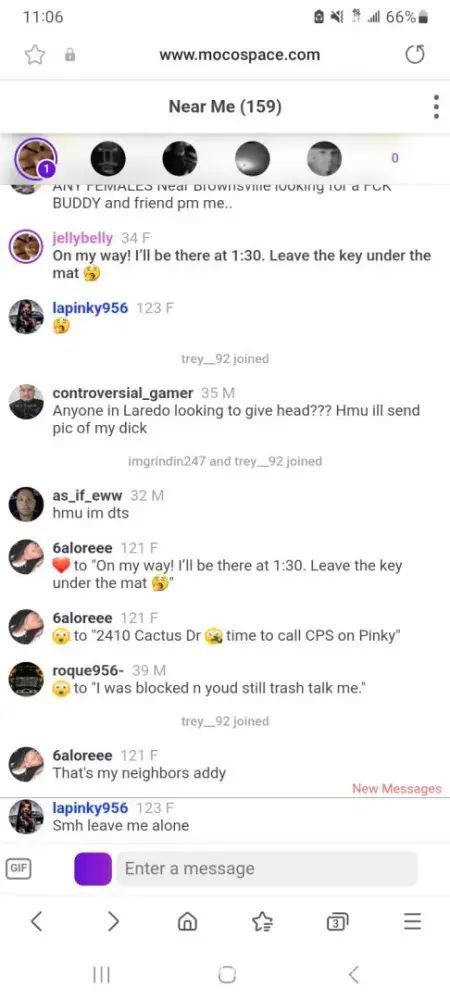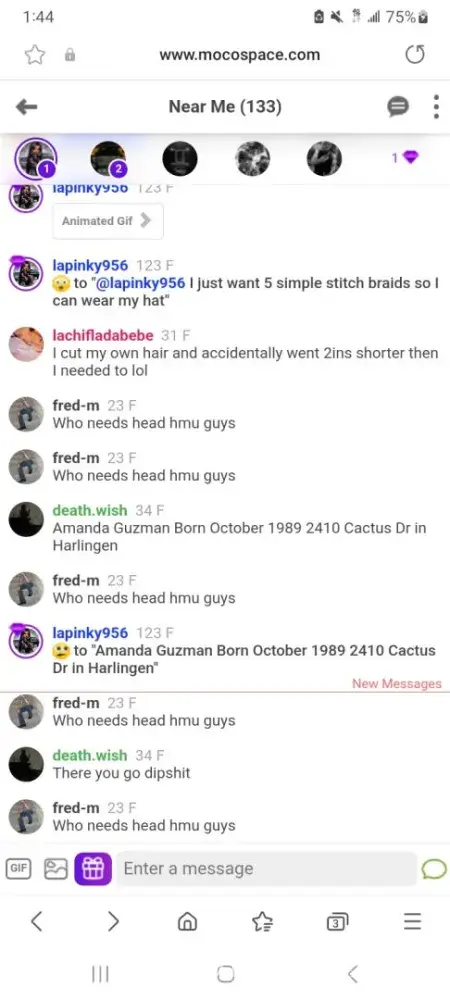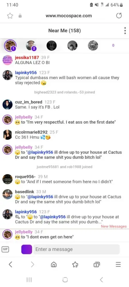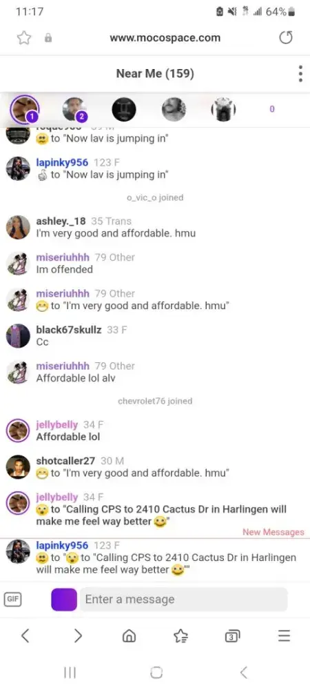 People are doxxing my personal information on mocospace and putting my family in danger and threatening me with CPS for no reason when my son's NOT in any type of danger. Things need to be stopped before I sue moco for allowing my personal information being posted and they not muting or banning anyone for it. They've been nonstop harassing me. I don't even like going in there no more without being bullied or attacked by majority of the men