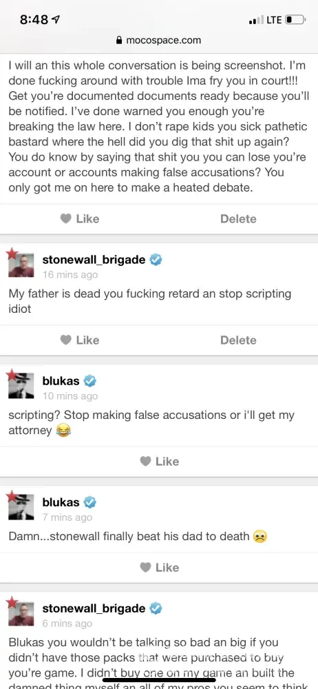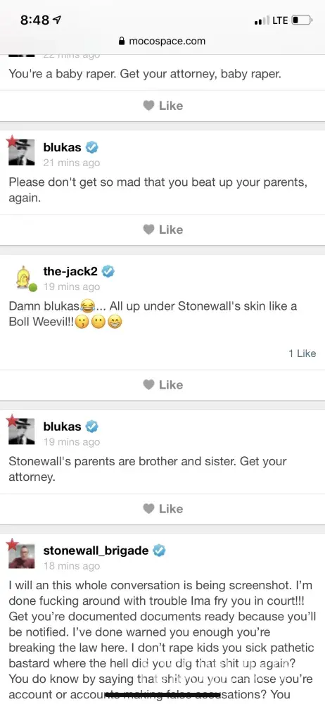 I'm constantly being attacked and my 3 year old son is constantly being brought up with disturbing stuff by GROWN MEN. I'm at the point of sueing moco because of it. I already filed a complaint and nothing has been done about it. I also reported a pic they made me of on mocospace and nothing gets done about it. Yall don't realize that if someone commits suicide because of it mocospace will me held responsible for it since nothing gets done. It needs to end now and being stopped today.