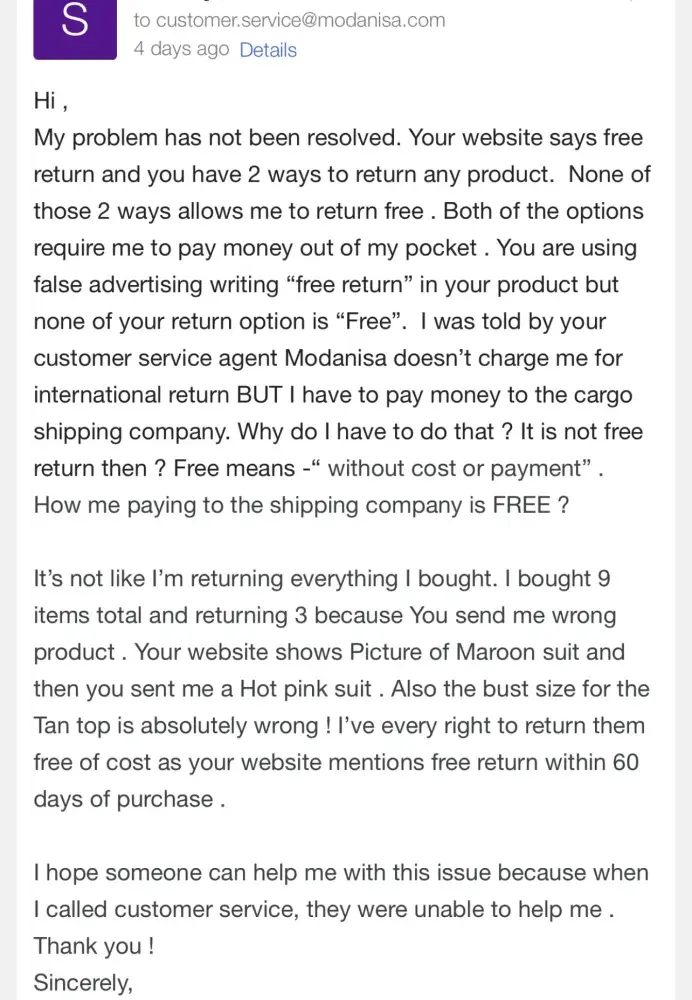 Modanisa's website says they offer free return but none of their return option is free . When I called customer service, they were unable to resolve my issue. I kept emailing modanisa's customer service email address but they didn't respond to my email . I think this is very unprofessional for a company . They are avoiding a customer where they are supposed to resolve the issue . I bought the seeing their false advertisement of Free Return .