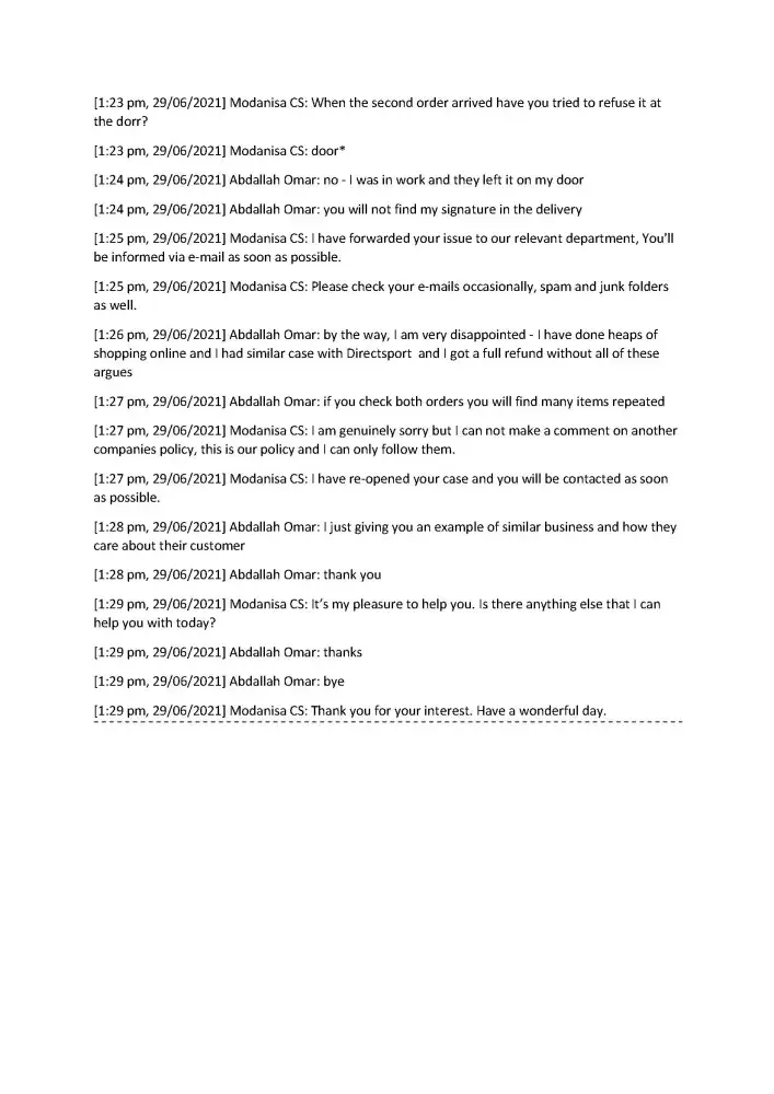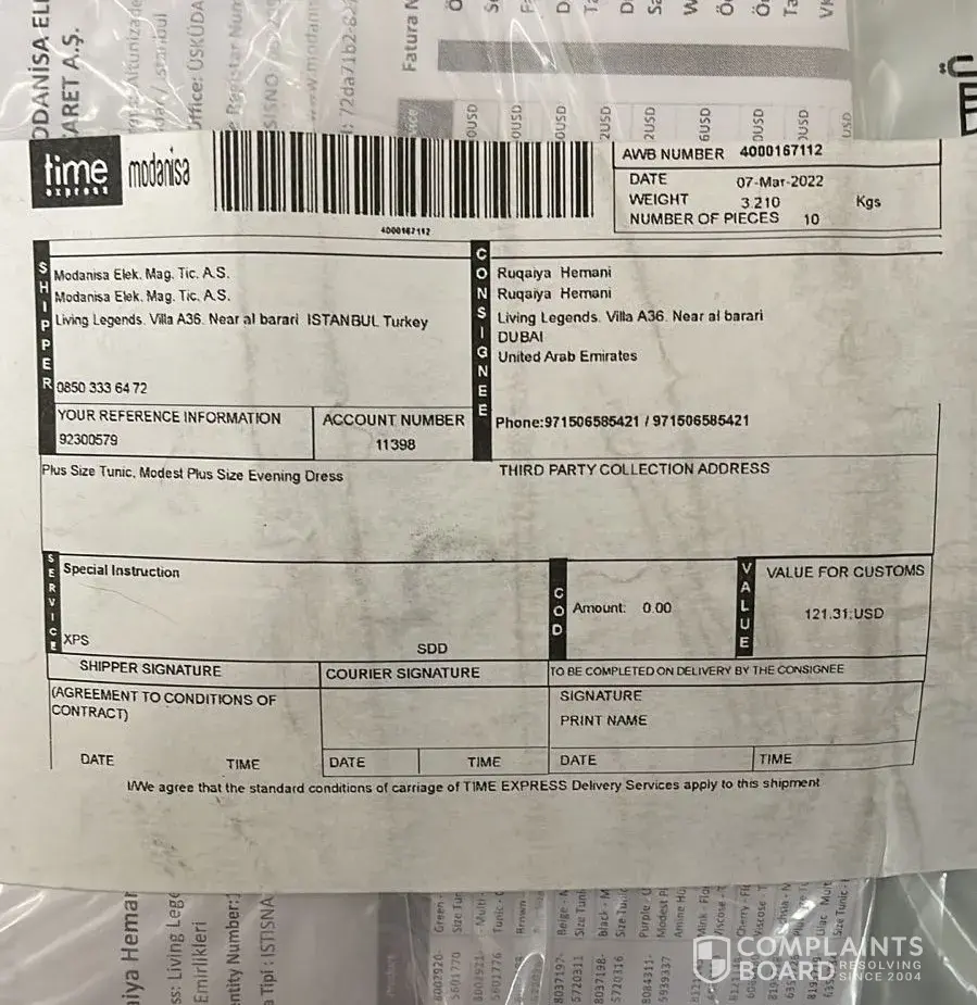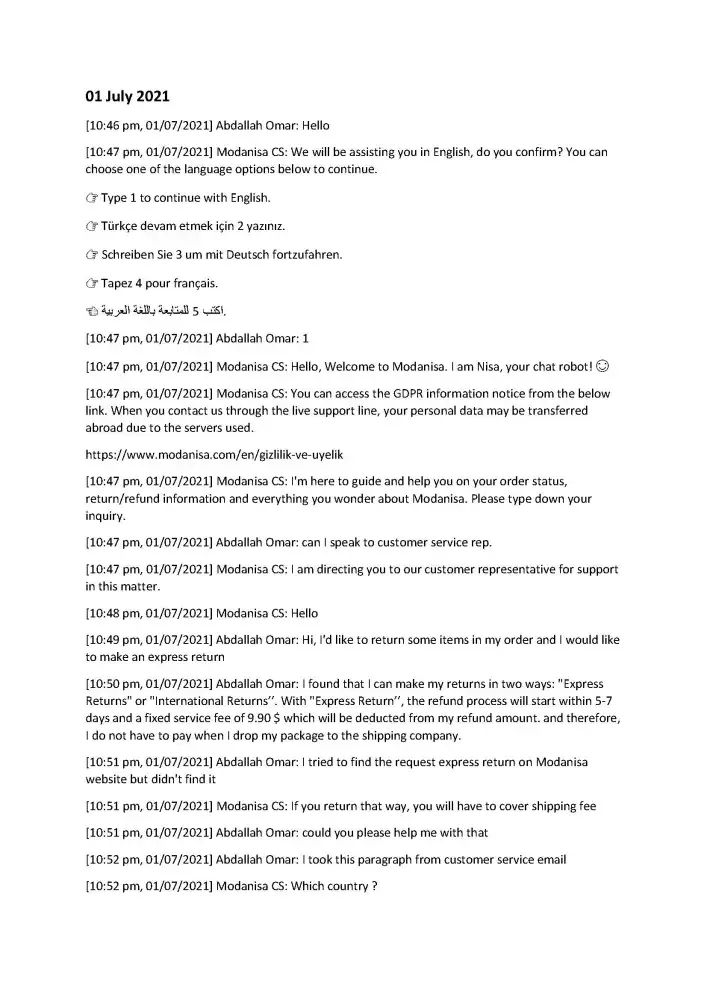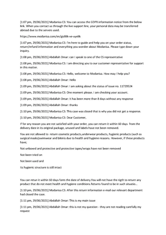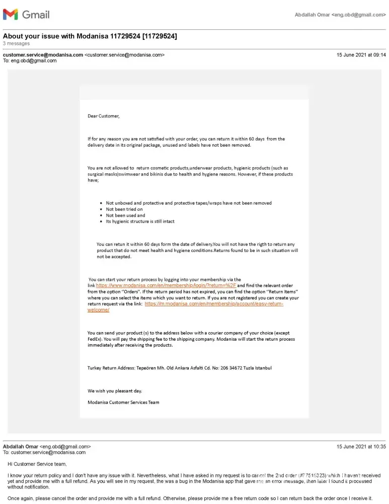 I hope that the Modanisa team would respect their customer and our time, and to consider my complaint and solve it.