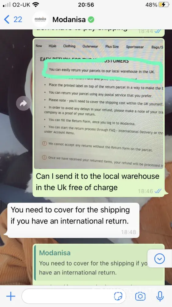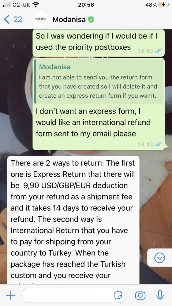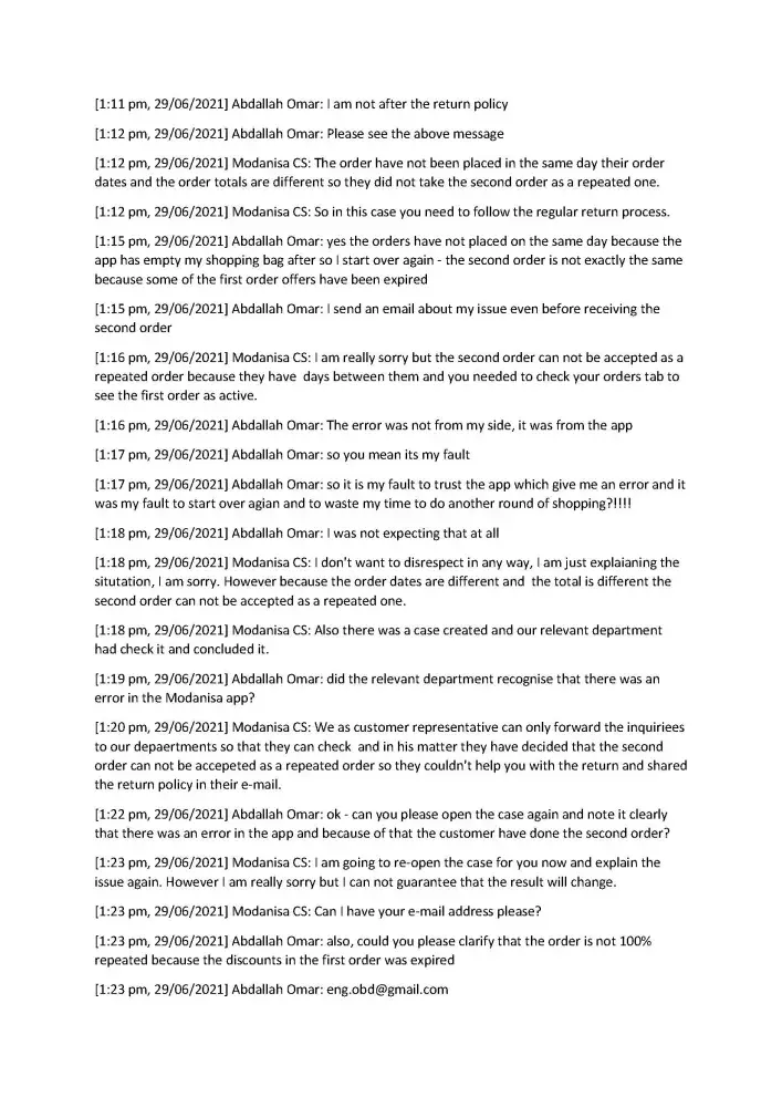 At the end I received an email from the CS team that mentioned that I could return my packages through express return with a fixed service fee of $9.90 which will be deducted from my refund amount and I don't have to pay to the shipping company when I drop your package. Therefore, I have done all the packaging and tried to find how I can do the express return on Modanisa website but I didn't find it. I contacted the CS team again through whatsapp and the CS rep. said that I am not eligible for the express return! which means that I have done all of the packaging for nothing. I was very disappointed because I wasted my time as a result of Modanisa again (this time because the CS team provided me incorrect information) Moreover when I tried to explain my dissatisfaction to the CS rep, he/she terminated the conversation after 2 minutes while I was writing! I even requested the CS rep. to escalate my issue and he/she ignored my request (please see my whatsapp chat for reference)