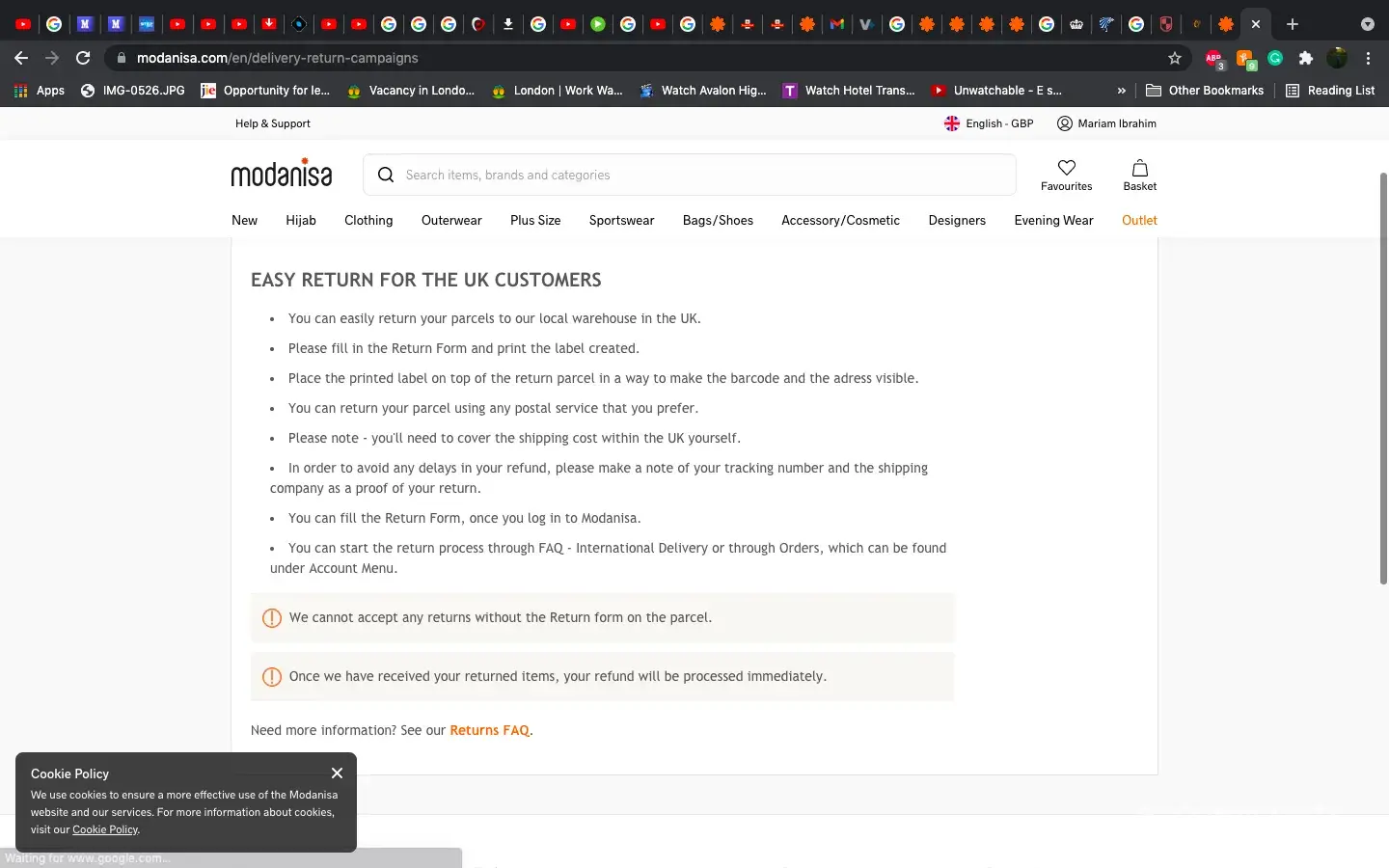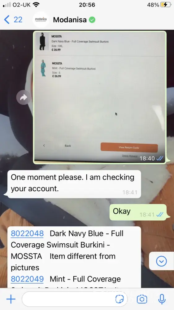 I ordered 3 burkini's, all of which had a satin material and are quite thin unlike in the images where it looks thick and elastic (as a swimsuit should be), When I came to refund the items I was informed that I had to pay £9.90 on each of my packages (two packages) although when I came to look at the product itself the refund policy wasn't there, anyways when I contacted customer service via WhatsApp, I asked if I could refund for free as the items are faulty and not as described, but was informed that this wasn't an option, then I asked if I could at least put the items together so I wouldn't have to pay delivery for each package and they still said no. If the quality of the burkini wasn't poor I wouldn't have requested the refund in the first place, so why am I paying the price for modanisa's mistake. Also on their website it says that they have a warehouse in the UK which when I asked customer service where this was I was told that there isn't one, so if there isn't one why would you put misleading information on the website. I would like to refund all three items with no delivery fee.