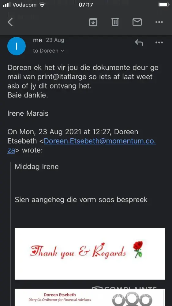 I felt sick literally now I have nothing I owed people money I don't have anymore. I made big birthday plans I can't commit to anymore all because of her Doreen Etsebeth from Momentum. I asked her to let her superior call me. His name is Francois Kroukamp. I was crying hysterically when he called me and said we have a problem I asked him how can someone working with lives make such a mistake and she is in service of Momentum for more than 4 years.
