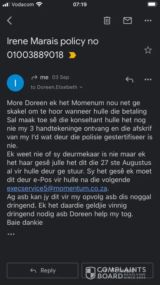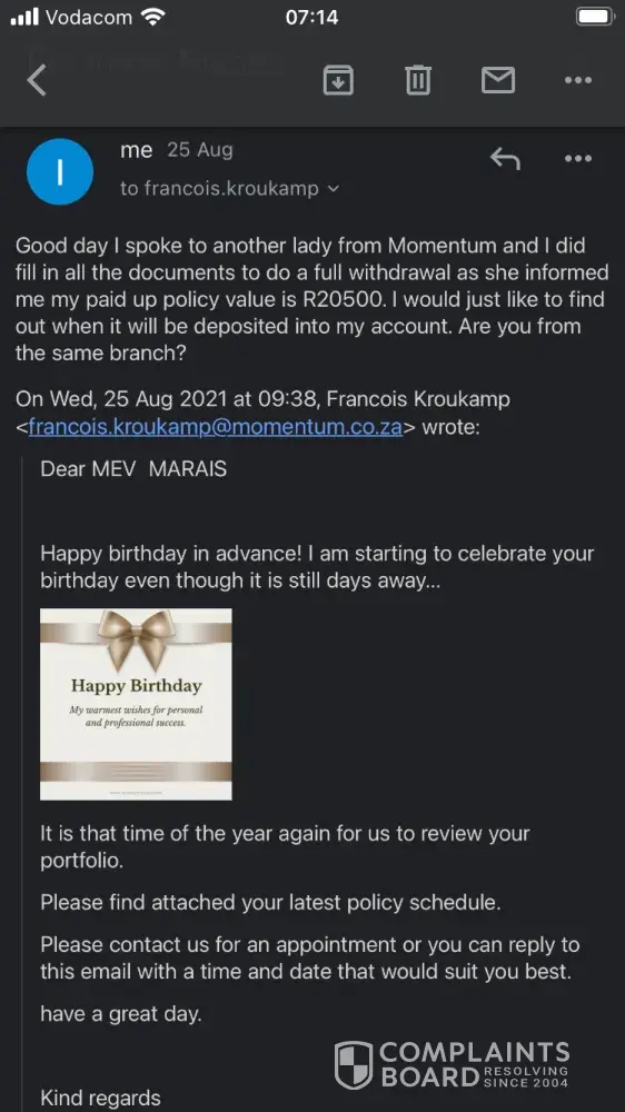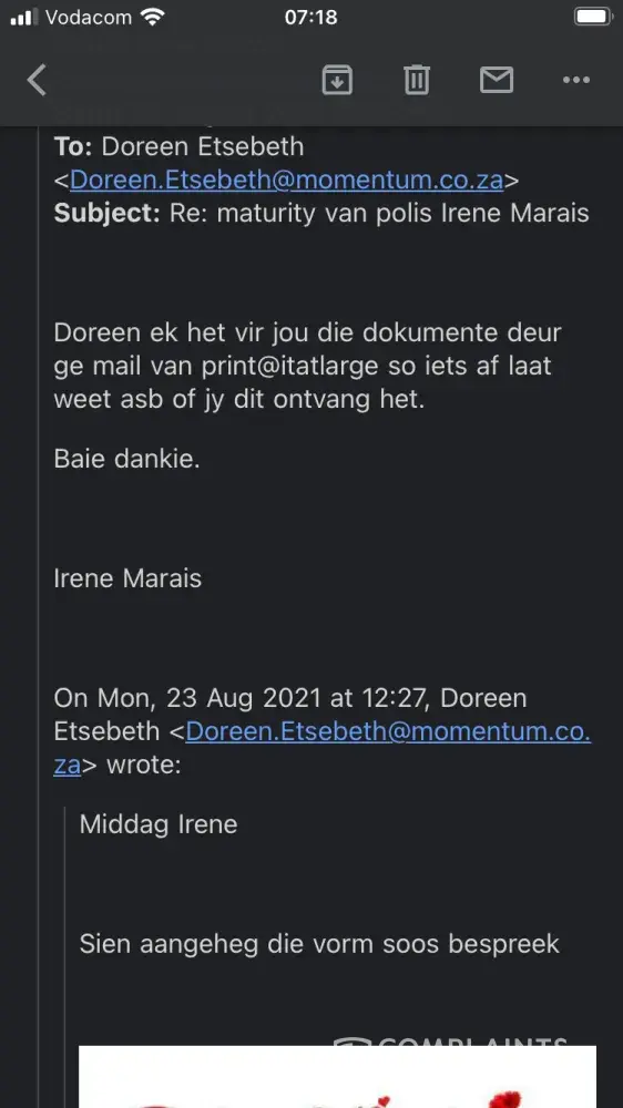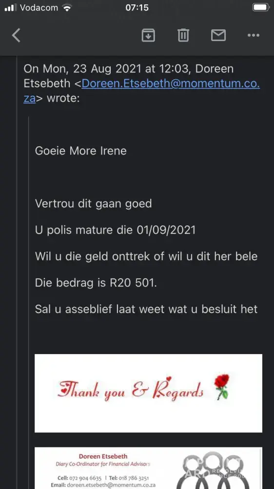 Dear Momentum I'm contacting you with great disappointment and frustration. On October 23 I received a email Happy birthday in advance from one of your employees Doreen Etsebeth. She gave me a call later to inform me that I have a paid up policy for the value of R20500. I was extremely surprised and so grateful and excited. She then send me forms I had to fill in and email it back to her. I did it immediately that day.