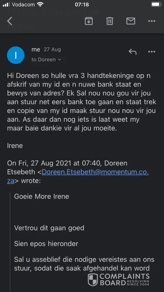 On 6 September I called her again asking when she thinks I will receive the deposit of R20500 she then send me a confirmation email from Momentum that they received all the documents on 6 September and now again in 5 to 7 working days she said I will definitely get the money. I thanked her and told her how this is a God send and how desperately I need it for my son's dental work.