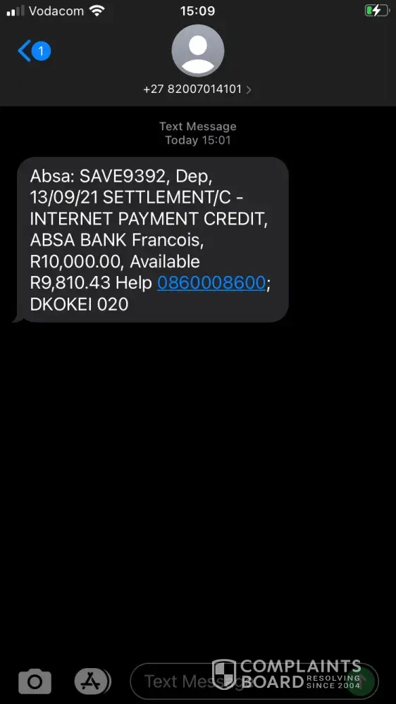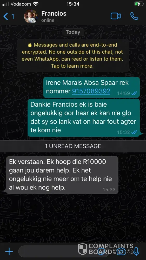 Francois told me he has Covid and is working from home and he didn't know about the mistake she had made. I told him I now owe people money I don't have and I made plans I can't do anymore. Francios then told me he will pay R10 000 in for me out of his pocket for the money I had borrowed, and he did.