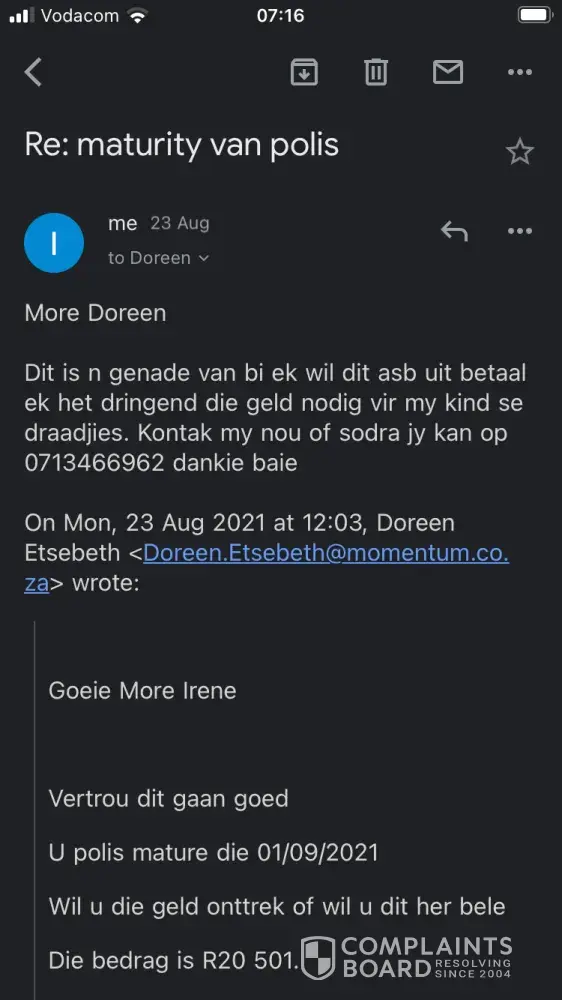 I really want steps to be taken against her as she ruined my year and my 40th birthday. I've feel I've been mistreated and because of her I made big birthday plans and now I'm humiliated by her and had to cancel my arrangements all because of Doreen Etsebeth who are not capable of doing her job correctly and works for Momentum this big famous company. I have all the proof of the emails she sent me and I screenshot it and wil attach it to this email. So you can see why I'm so bitter and feel like I want to expose people like her who ruins people's lives like she did mine. And one more thing I spoke to a Momentum consultant over the phone and I know all calls are recorded and I received a email from a Moodly who works at Momentum not one of them told me what amount will be paid out to me, why didn't one of them gave me information on my account I totally depended on the amount Doreen Etsebeth gave me and emailed me and I made arrangements accordingly. You will never understand how greatly disappointed humiliated and crushed I feel right now. I was sick in bed the whole of yesterday. Momentum I need a uge apology from you I made a fool of myself by making big birthday arrangements to important people in my town and life I'm just so so unhappy. Not one, one of your employees rectify the mistake and it wasn't like a day or 3 I was under wrong conclusion by this for more than 22 day I hope you will address all who worked on my account and ask them why not one of them realised there was a problem with the amount. 3 or 4 different people not one picking up something is wrong. And at the end it cost me more than I got out from this whole policy. Here is the number of the office of Doreen Etsebeth who I wish I never spoke to in my life. [protected].
