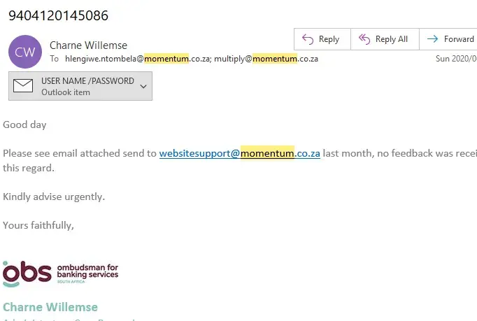 I sent my 1st email containing all the docs to clientcontactcentre@momentum.co.za on 23 September 2019.