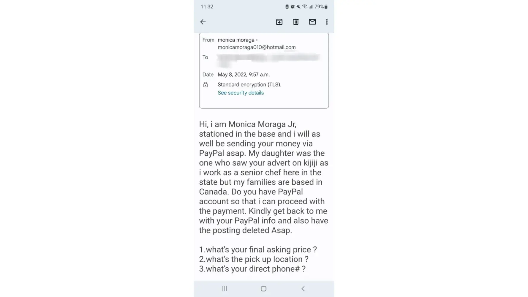 i just got same message for a stroller i have on kijiji. it was sent as a text to give direct email "cos" i get charged when i text or email my mom. moniccamoraga@gmail.com so i dont have paypal acct i replied to see if they could e transfer becasue little info for auto deposit is ok for me paypal charges fees. so waiting i decided to check the email address and it brought me here. i am sad because i got hopes up there being in money dispair between myself and toddler daughter so i really cud have used this sale so so much. i just wanted something to go my way and then this scam... how does this one pick its victims out do i put a "hey you over here i want to be scammed out of money i dont have lol pick me pick me pick me or is it randomly sent to unknowns to see who bites on it?