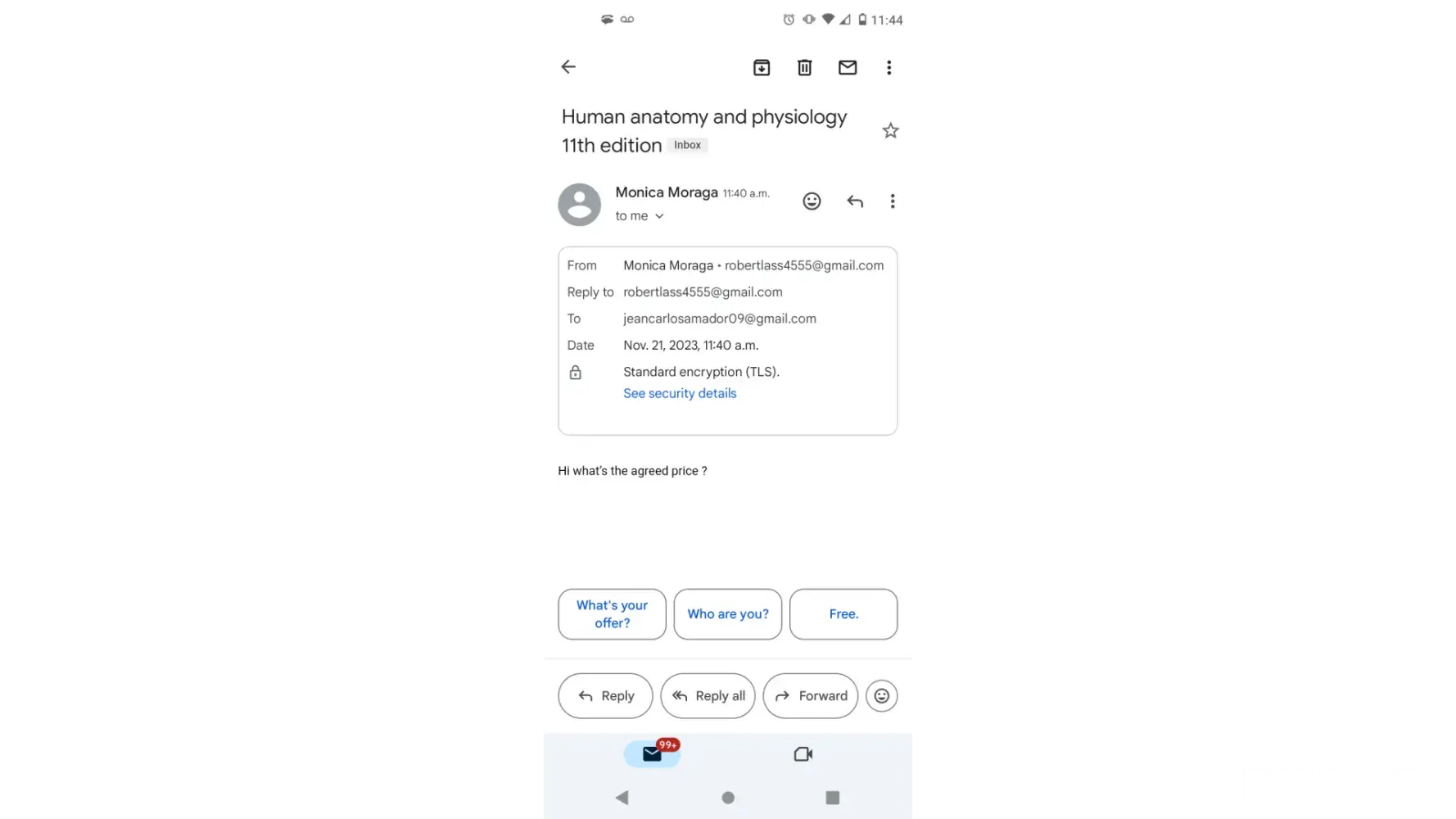 Just posted a ad on Kijiji and within 10 min recia text from a 805 # asking me to email their mom with details of my item and price. Found it a bit strange but emailed moniccamoragaa@gmail.com. got this response: