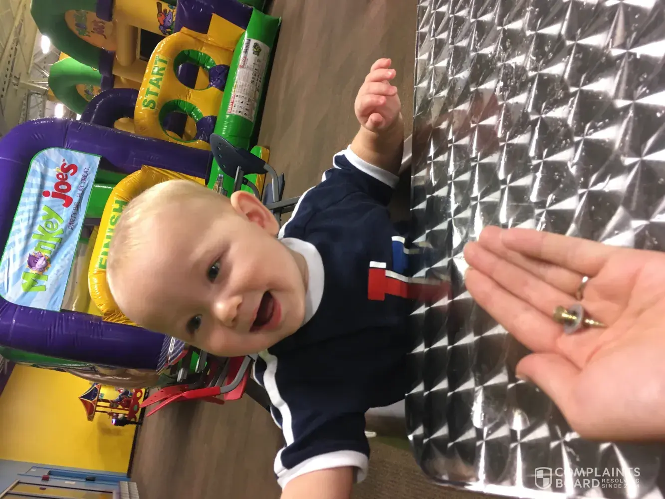 My 9 month old son was sitting by the table in his high chair and a nail and screw fell from the table and right into his high chair, I jumped up to get it before he did but he already had it in his hand and was a millisecond off shoving it in his mouth! Had he done so, we would have been taking a trip to A&E. Very concerned I took it to a member of staff who's response was simply "oh, did it fall from the table or high chair" I said the table and she said "oh okay" I said well the table is wobbling now and I don't think it's safe. She just looked at me. No one came to check if we were okay, or on the table. No I'm sorry, nothing. Me and my friends/family go to this monkey joes ALL the time and I feel like never going back. I get that accidents happen but it's the response to the incident that counts! My son could have been seriously hurt!