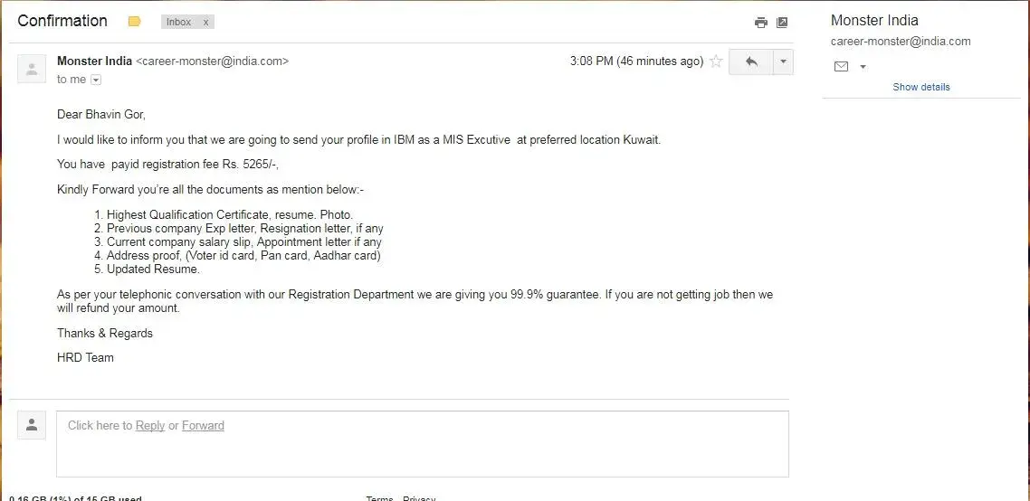 I got an email from Gulf human resources‏ gulfhumanresource@yandex.com few days after i registed in monster gulf, sent applications to be filled, and so on then a fake contract wanting me to pay 1500 $ us for the work permit through a fake travel agency that looks like the legit one BE CAREFUL OF HOW EMAILS ARE TYPED