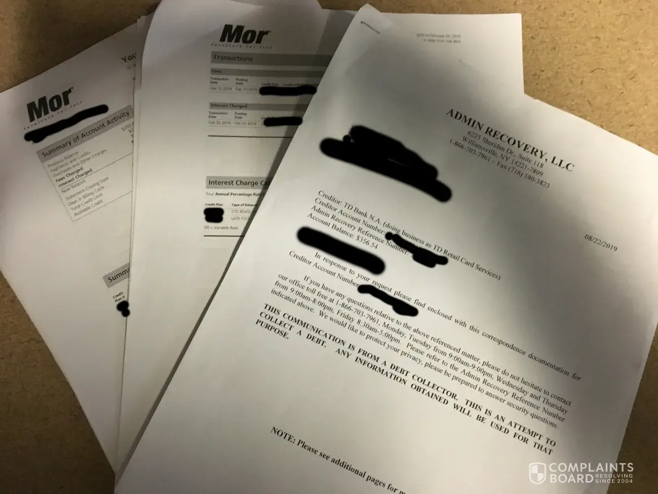 Finally, in late August, I once again called (after not receiving ANY call back, any email, any text, not even messenger pigeons) from MOR/TD Bank since our last bill in Sept. of 2018. Same thing, threatened to transfer to Admin Recovery, I have to ask to speak to a supervisor, then a second supervisor before finally getting someone to help. And guess what? They actually tried something. They were getting the account BACK from the Collection Agency - so that I can pay TD Bank the outstanding balance. Over Labor Day weekend, I got a letter I had to sign for, it was the letter from Admin Recovery and ALL OF THE STATEMENTS from Oct. 2018 to present that I had never seen, never been sent (via US Mail, email, text, anything!). Not wanting to deal with this any longer, I simply paid TD Bank the $356.54. There was never an apology. This was one of the most unprofessional encounters I have ever had. Beware!