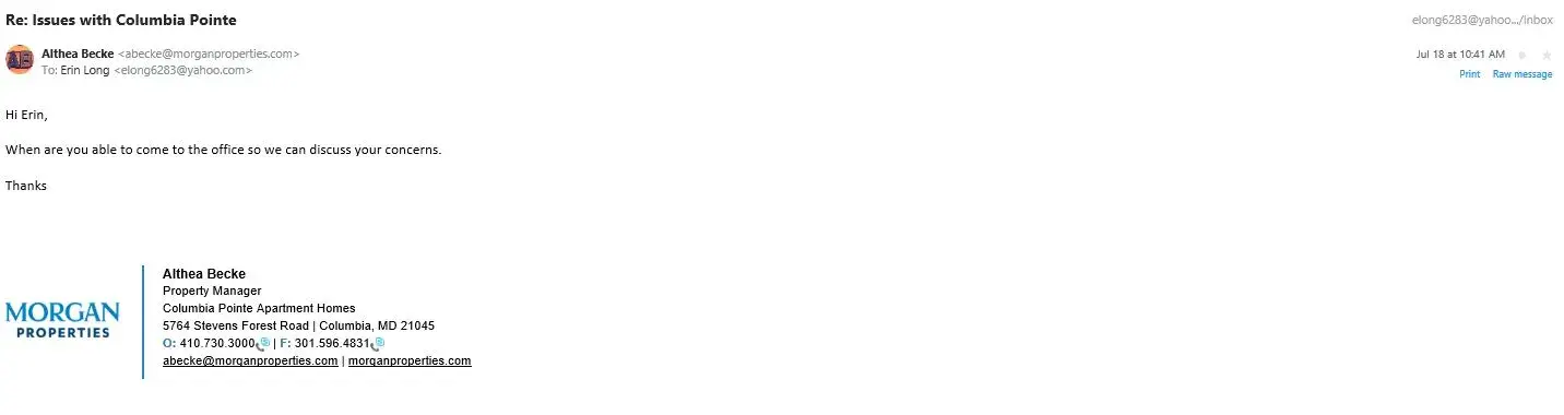 I reached out to the Property Management office in the middle of July to discuss several of the issues I have been having with the apartment and the property, see list below. The only response I received was the schedule an in-person discussion. I immediately responded to explained that this was difficult as I am normally at work during the hours the office...