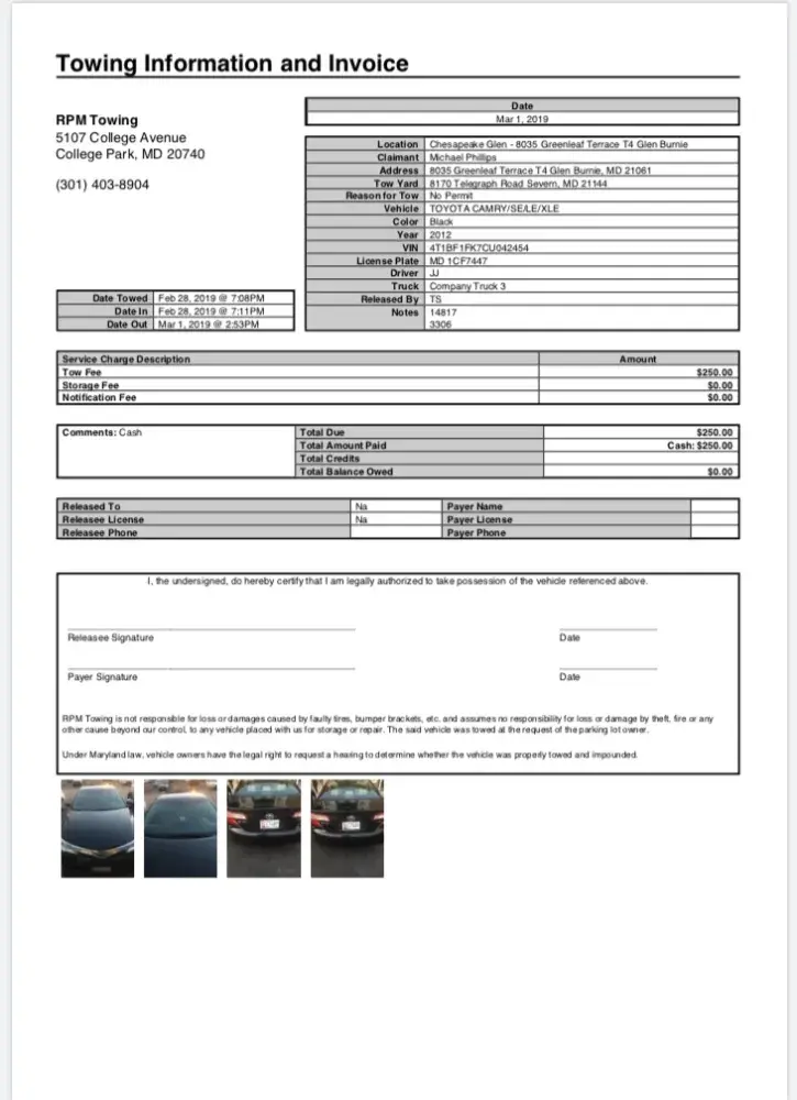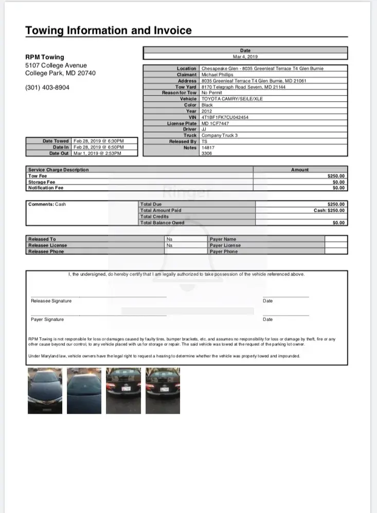 I am writing to file a formal complaint against morgan properties and rpm towing. I live in chesapeake glen apartments and my vehicle was towed on february 28th, 2019 from infront of my apartment building at 8075 green orchard road, apt 23, glen burnie, md 21061 at or around 6:30 pm. I retrieved my vehicle from the tow yard the next day on march 1, 2019 in odenton, md and was told I would have to pay $250 instead of $175 in order to get my vehicle back. I drive a 2012 toyota camry that weighs about 3, 300 lbs. Anne arundel county's police max towing fee for vehicles under 10, 000 lbs is $175 unless storage fees have been added or special towing procedures were used. Why would you all charge residents and visitors $75 more than the average tow fee in every other county and neighborhood in maryland? That's ridiculous and downright wrong. You set people back almost $300 in their finances for a parking mistake and these are your residents and their visitors that you're doing this to. Regardless, to the 24/7 permit parking policy why would you be towing at 6 pm on a weekday, anyway?! People are coming home from work, dropping kids off, taking groceries in, non-residents are picking up kids from babysitters, delivering food people ordered for dinner, etc. And you're telling me if they're not parked down the street in visitors to make a quick transaction during weekday rush hour hours, they'll be towed? Because that's exactly what is being explained to me by the property manager and is exactly what happened to me.