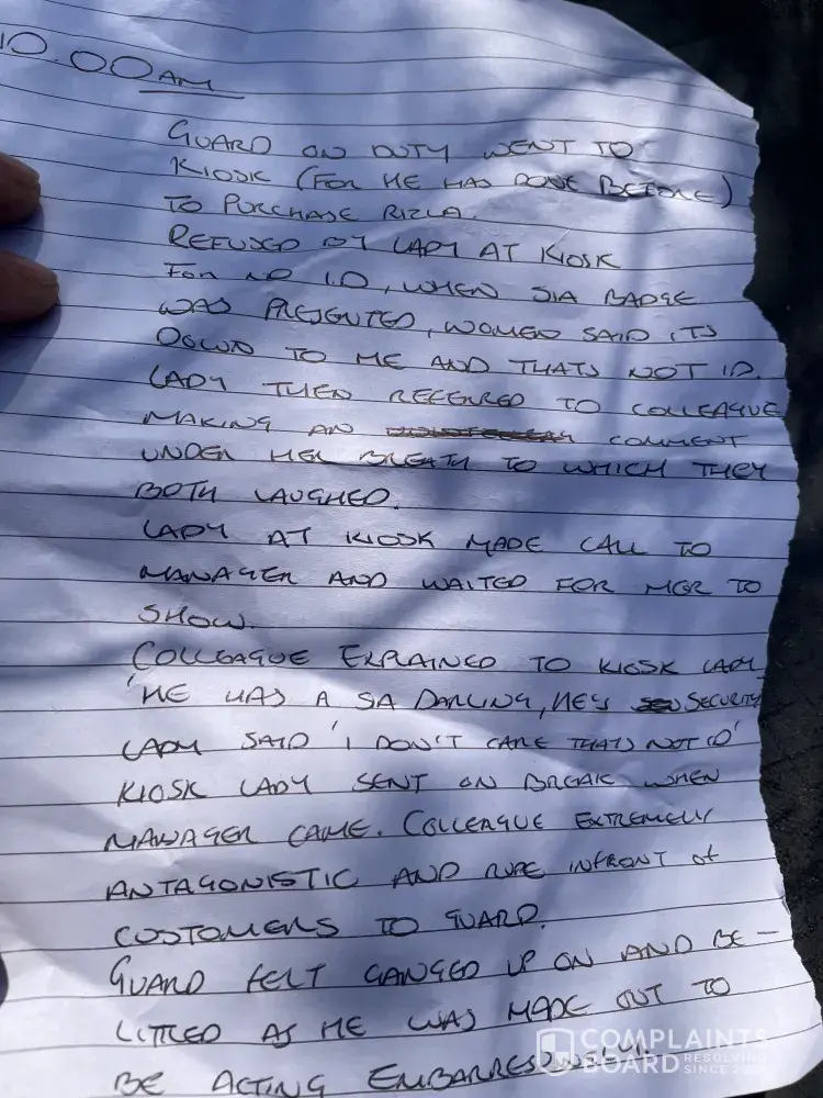 I worked as a guard for your Morrison's on sproughton road Ipswich. Two female workers were extremely rude to me embarrassing me in front of customers over ID to which I had presented (sia lisence) a manager was called and the manager then laughed and fabricated a story that I had been aggressive and rude even though it was a total lie. Pic provided. I was then sent home by male manager of store due to this and stil no way to make a complaint.
