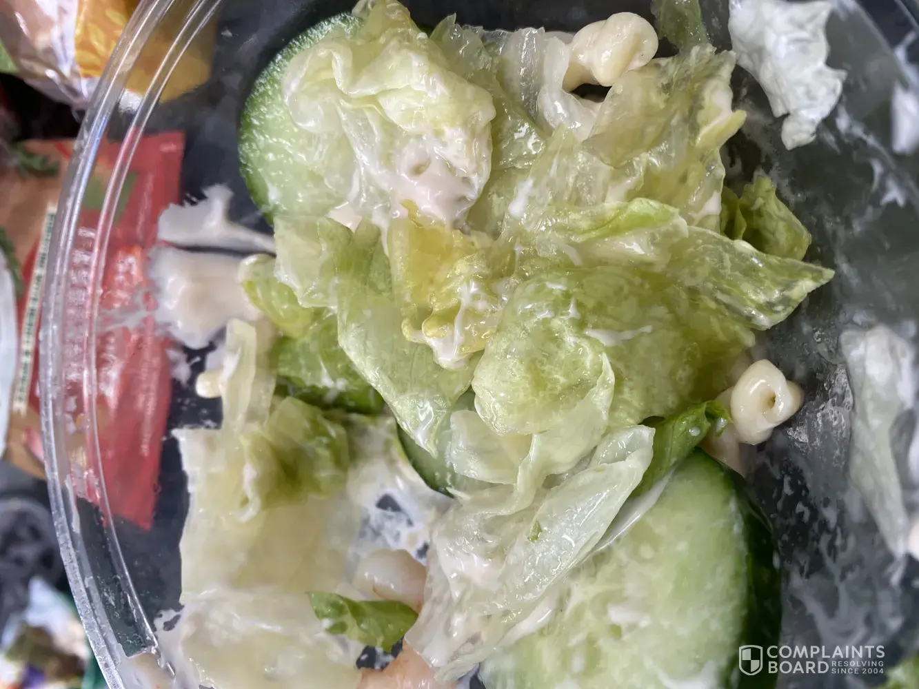 I bought a prawn salad today it was horrible the lettuce looks as though it had been frozen it was soggy and see through the cucumber was the same and at the bottom of the container was half an inch of water Please i spent £145 in your shop can't afford to buy food that's disgusting I ate the tomatoes which there were two slices and a few prawns but to be honest it was awful