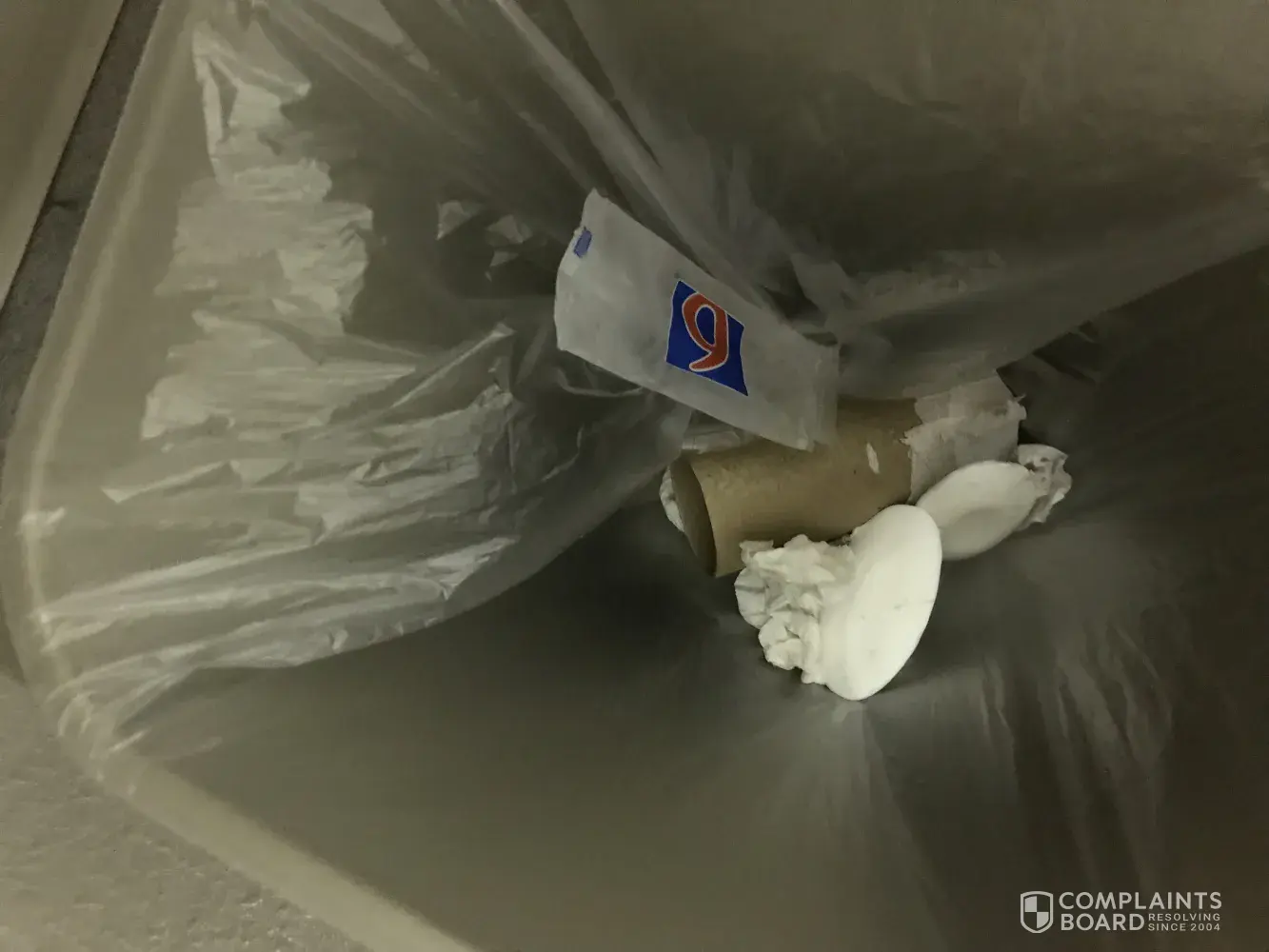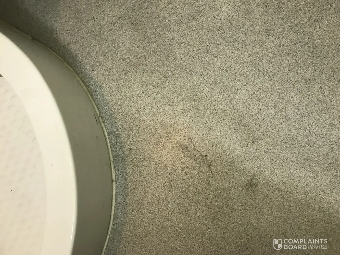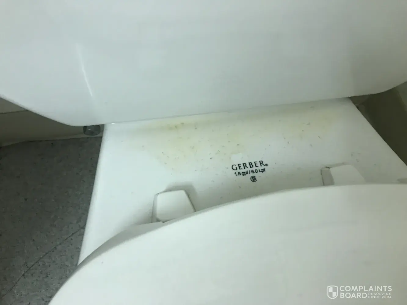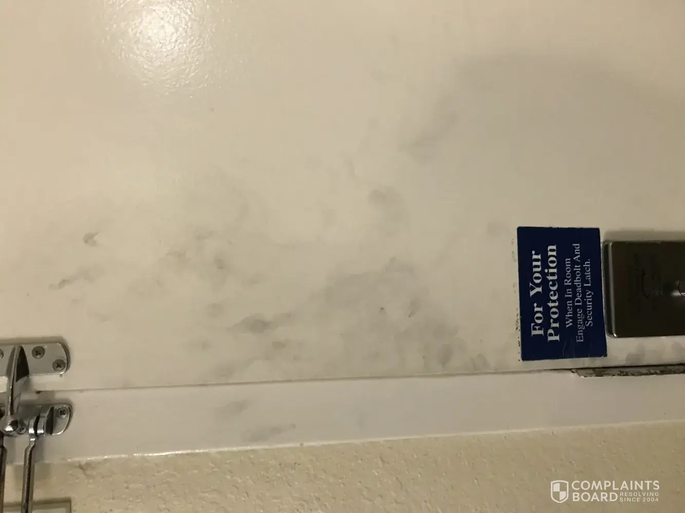 Very dirty bathroom coverd in black fingerprints and black hair. Toilet covered in black stains and urin. Sink coverd in hair and black stains. Floor covered with black sticky substance. Walls and doors are covered with black stains. Garbage cans are full off garbage. Desk draws are filld with empty pop bottles and potato chip bags. Remote control for TV was under the bed. Night stand covered in sticky substance. Phone coverd with black stains.