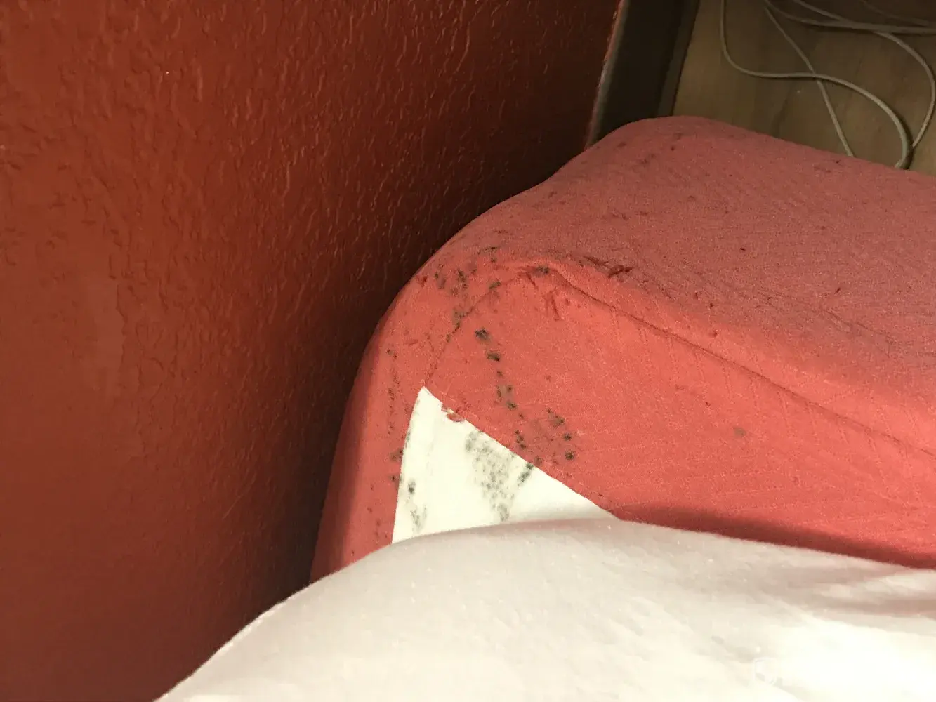 7. Here's the worst; I pulled back the sheet to lay down onto the first bed in the room and on the sheet were pieces of hair and something else. (don't have a clue what it was) the pillow case had a stain on it and so did the fitted sheet. Along with a pink spot under the pillow.