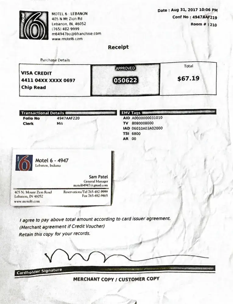 I was staying at the Mote; 6 on Rt9 Framingham Mass from 8/25 to 8/27/2017