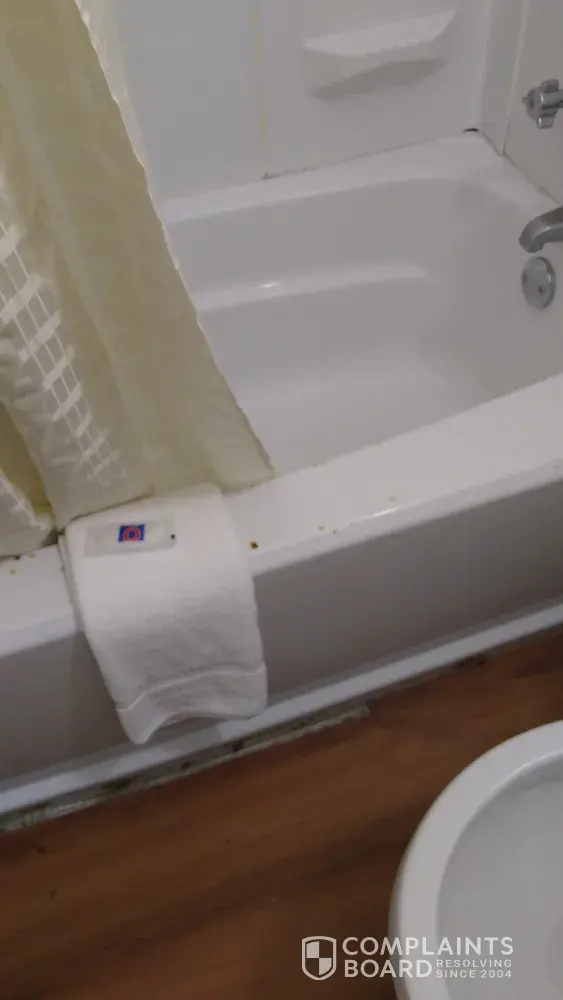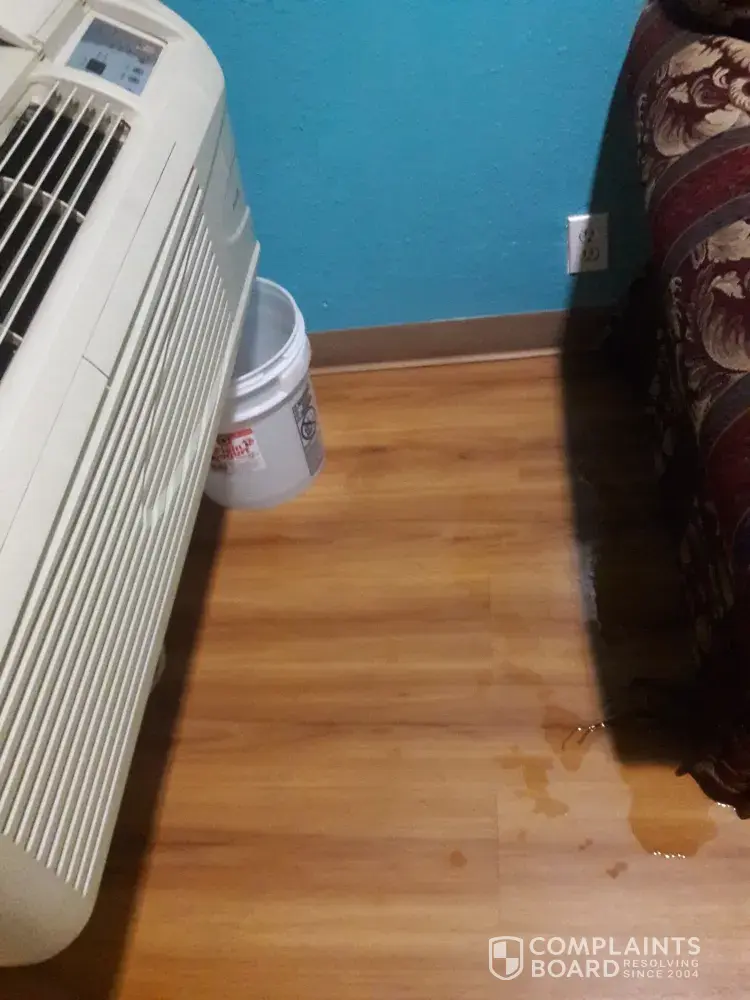 When my husband and I walked into the room it had a bucket under the air conditioner (which my husband had to empty), it also had water on the floor, holes in the wall, door jam dented in and rusted, chair had stains on it, toilet seat not on completely.